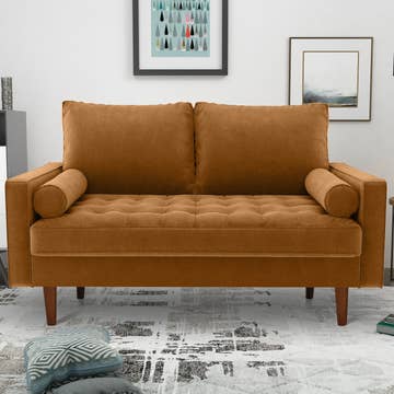 This modern-looking yet simple loveseat will be your most favorite piece in your modern space. It features a sleek design, tapered wooden legs, sturdy Eucalyptus wood frame, round arms, and quality velvet upholstery fabric. The cushions are filled with thick foam and wired springs that provide your guests and you the ultimate comfort. FEATURES: * Wrapped in soft and luxury performance velvet fabric * Durable Eucalyptus wood frame and tapered wooden legs for a timeless look * Seat and back cushions are filled with high-density foam and sinuous springs for topmost comfort * Partially assembled, it comes with a user-friendly assembly manual and all needed hardware MEASUREMENTS: * Dimensions: 57.8” L x 30.3” D x 33” H * Seat Length: 50.8” * Seat Depth: 19.5” * Seat Height: 18.5” * Leg Height: 7.5” * Product Weight — 56.2 lbs