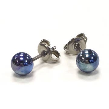 This listing is for a lovely little pair of handmade glass stud earrings in a silver laden navy glass for a reflective metallic effect. Made in a torch flame and carefully annealed in a kiln overnight to prevent any breakages these earrings would be perfect to complement an outfit or as a little gift to someone. The backs are Surgical Steel, a completely safe and hypo-allergenic metal. The steel backs are fused into the glass while it is still hot, so no glue is needed. As they are handmade, the size of glass varies between 5 and 7 mm, but is consistent within the pairs. They were made by me, in my studio in Edinburgh, Scotland. I am happy to ship worldwide, although please bear in mind shipping outside of the UK can take up to 2 weeks. If you have any questions, please feel free to contact me. Thanks for looking!
