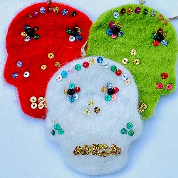 Miguel The Skeleton is eager to celebrate the Day of the Dead! Collect him and his friends from the Spooky Eco Freshener Ornaments collection. It's a fun, eco-friendly, plastic-free way to decorate your porch, home, car, or treat bags! Add a few drops of your favorite essential oil and scent away! Comes with a 3" string so you can hang it anywhere you like. Hint: our spooky eco fresheners look wonderful paired with our handmade garlands, trivets and coasters! Fair trade, lovingly hand made by Nepalese women using only cruelty-free certified New Zealand wool, vegetable soap and warm water. Colored with eco-friendly azo-free dyes. Plastic free and compostable. Miguel The Skeleton measures 2"x 4.5".