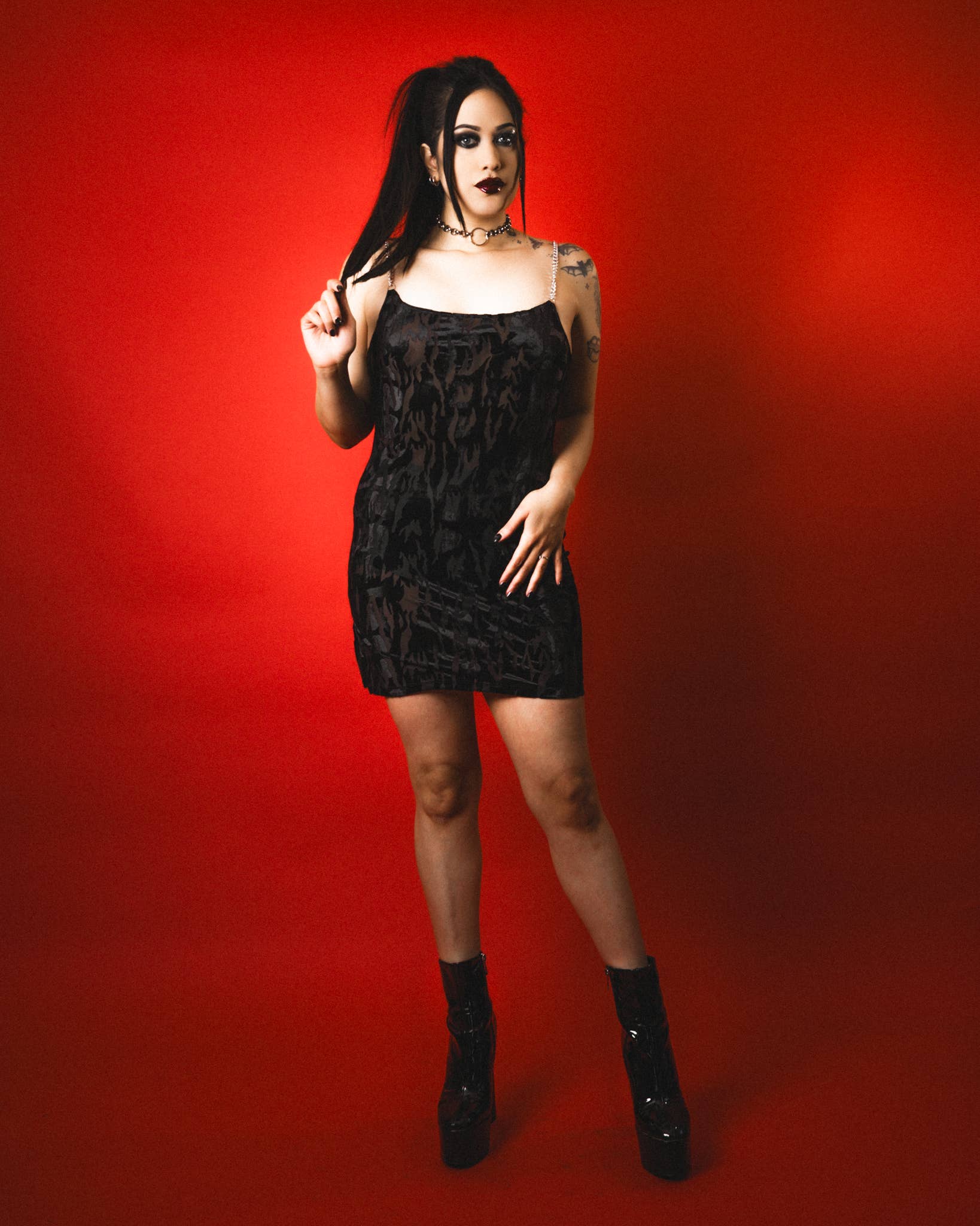 Our signature style dress made from a semi see through luxe burn out black velvet. Has a bit of swing and comes to just a bit above the knee, pair it with a pair of shorts or your favorite TPC underwear! Material: vegan burn out velvet Models wears a size small Designed by us in the Haus Of Cult