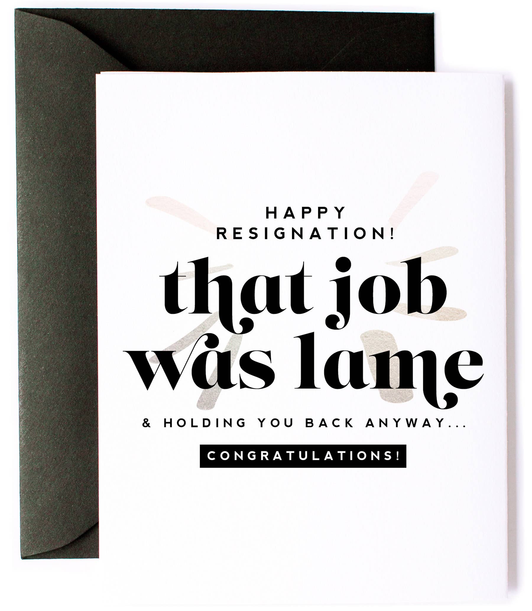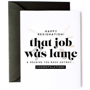 Celebrate job freedom with Kitty Meow's "Happy Resignation" funny new job greeting card! This hilarious card congratulates anyone who quit their awful job for better opportunities. Perfect for retailers stocking funny job quitting cards, resignation celebration greetings, or career change encouragement cards. Your customers want cards celebrating leaving bad jobs, and this honest message delivers that validation perfectly. 🎉 Hilarious resignation message - "Happy Resignation! That job was lame & holding you back anyway!" validates quitting bad jobs 💪 Perfect for career changes - Ideal for friends quitting jobs, coworkers leaving, career changers, or anyone escaping bad work situations 🖤 Black envelope included - Comes with a sleek black A2 envelope matching bold, edgy celebration style 📏 Standard greeting card size - 4.25" x 5.5" folded card printed on bright white, thick card stock ✍️ Blank inside - Space for encouragement messages, new opportunity wishes, supportive notes, or celebration messages This funny resignation card works for last day celebrations, career change support, escaping toxic jobs, or pursuing better opportunities. Blank inside provides room for genuine encouragement and excitement. Perfect for bookstores, gift shops, office stores, and retailers serving career transitioning customers. Great for resignation parties, new job celebrations, career freedom, or validating leaving lame jobs. Popular year round for job quitting cards and funny resignation celebration greetings. Resignation wishes celebrating freedom from jobs that were totally lame!