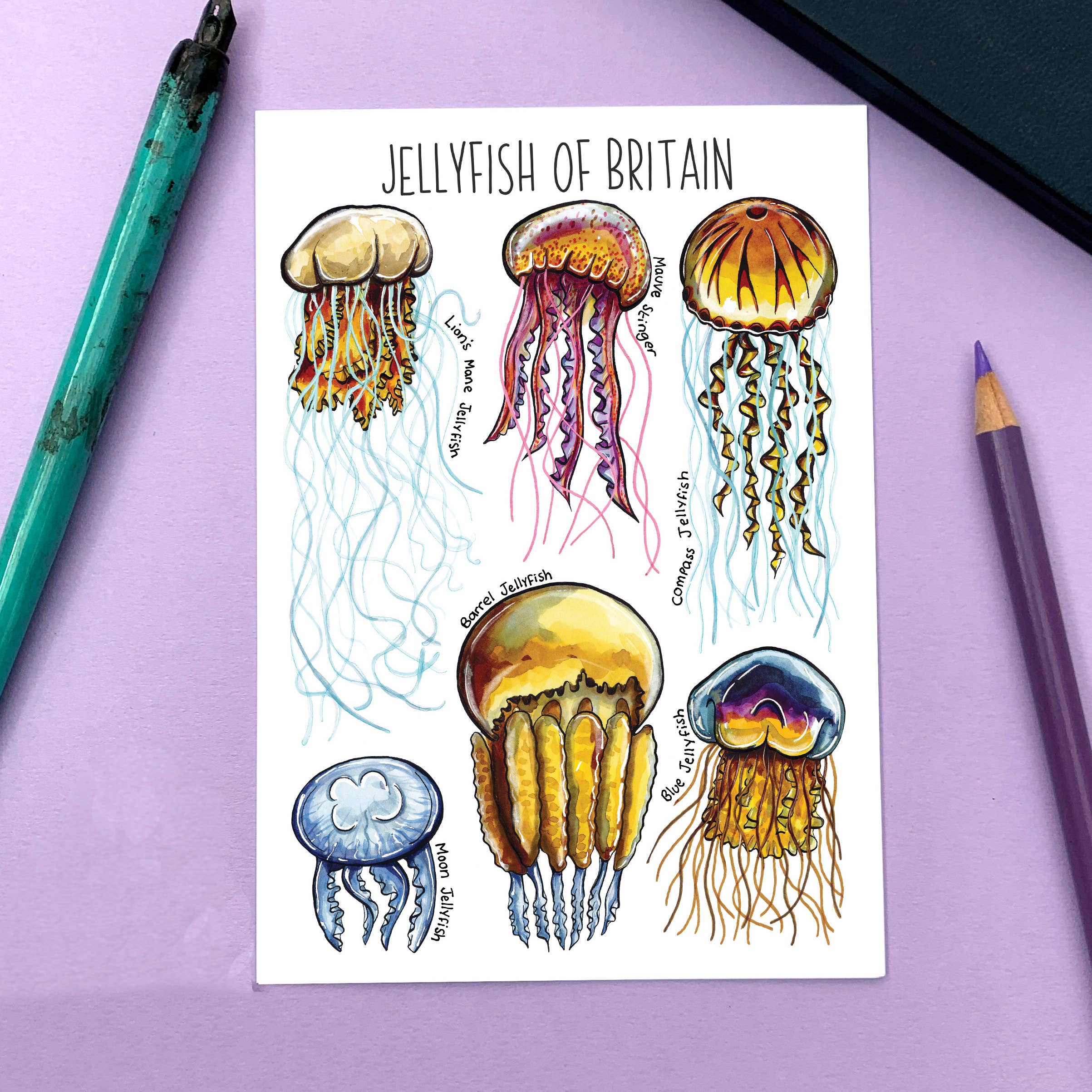 Skates & Rays of Britain watercolour illustrated postcard. Blank on the reverse. A6 sized. Hand painted by Alexia Claire.