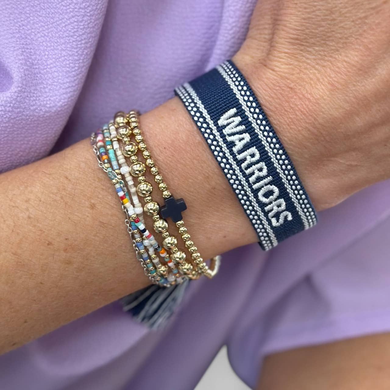 These are great quality bracelets that sold so fast, I was placing a reorder within 2 days. The dark blue would work for a dusty blue or a true navy (our color). They are a great spirit item because they can be worn on game day, to school, and with just about any outfit. They look so nice. We got many, many compliments on these bracelets! The price point is on par with similar bracelets. My ONLY note would be to have the holes punched on the corners of the cards (like in the listing photo).