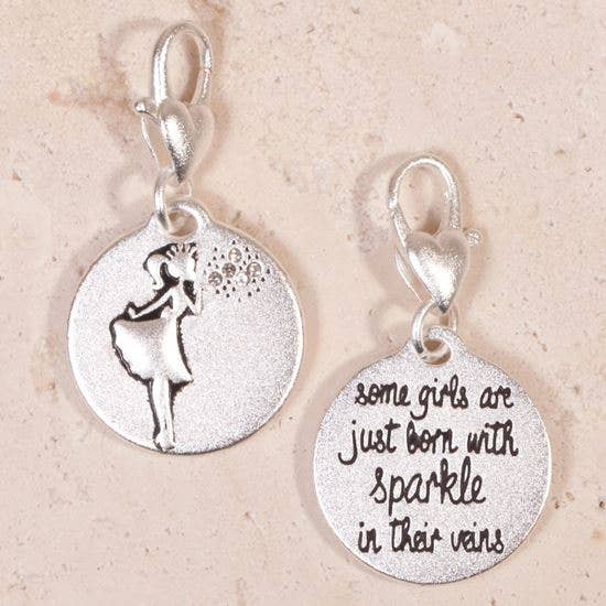 This kitschy art charm features vintage burlesque dancers in violet garb offering encouragement to be bold and be fabulous! Charm size: 1" by 1".