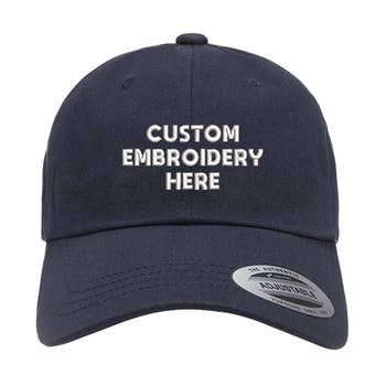 Part of our 'Custom' collection, this low-profile unstructured dad cap is simple and straight to the point with a subtle vintage feel. Represent your town, storefront, or organization. Let us know what text you want and we can prepare a digital concept. Need something else entirely custom and not shown here? Just drop us a line. We can do anything! Fabric: 100% Cotton Structure: Unstructured Profile: Low Closure: Self-fabric slide closure with brass buckle and grommet One Size Fits Most