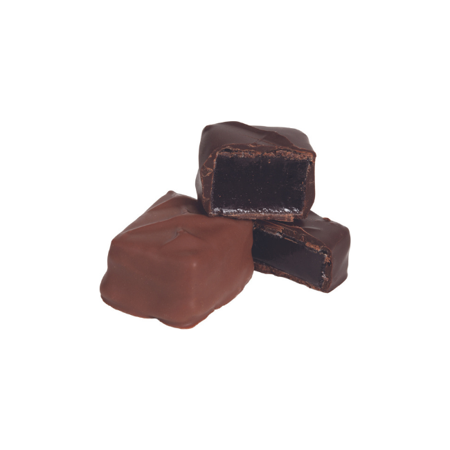 Orange jelly covered in gourmet dark chocolate. Bulk product, not packaged. 5 lbs. per case. approximately 28 pieces per lb.