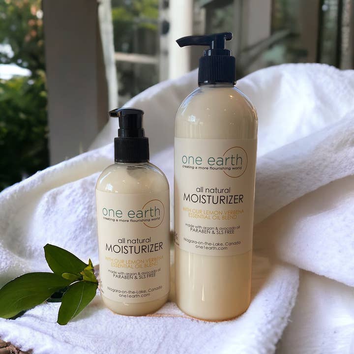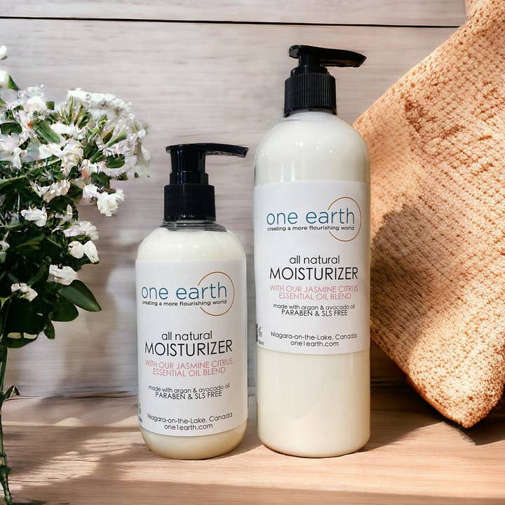 Enjoy the luxurious blend of Orange Blossom and Peach essential oils in our all-natural moisturizer, crafted from organic argan oil. Our 24-hour protection formula helps to soothe and hydrate your skin, leaving it feeling soft and nourished without feeling greasy. Free from SLS, Paraben, and Phthalate, our lotion is the perfect daily treatment for your body and hands. THIS PRODUCT DOES NOT CONTAIN ALCOHOL, IT IS NOT OUR SANITIZING LOTION 100% Natural | Tested on people not animals | Size/Weight: 250 mL 500 mL or 1 litre Less is more: Use a pea size amount and work up from there. Ingredients: Mineral free water, grape seed oil, avocado oil, argan oil, coconut oil derivations, vegetable wax, jojoba seed oil, shea butter, aloe vera leaf juice, vegetable, stearic acid, vitamin E, vegetable glycerin, apple syrup, vitamin C, green tea, coconut glycerin, comfrey plant & essential oils.