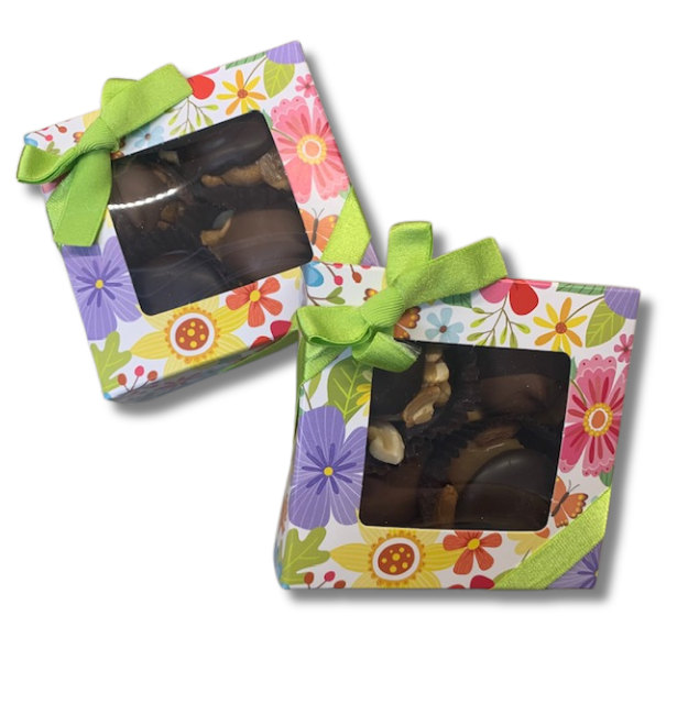Gift box of our filled eggs. Includes one each Caramallow, Creme, Dubai Pistachio, and Peanut Butter filled eggs. Gluten Free, Dairy Free, Soy Free, Vegan MSRP: $15-17 Ingredients: See ingredients for individual eggs. CONTAINS: PEANUTS, TREE NUTS Made on shared equipment with peanuts and tree nuts *note bunny from image is NOT included