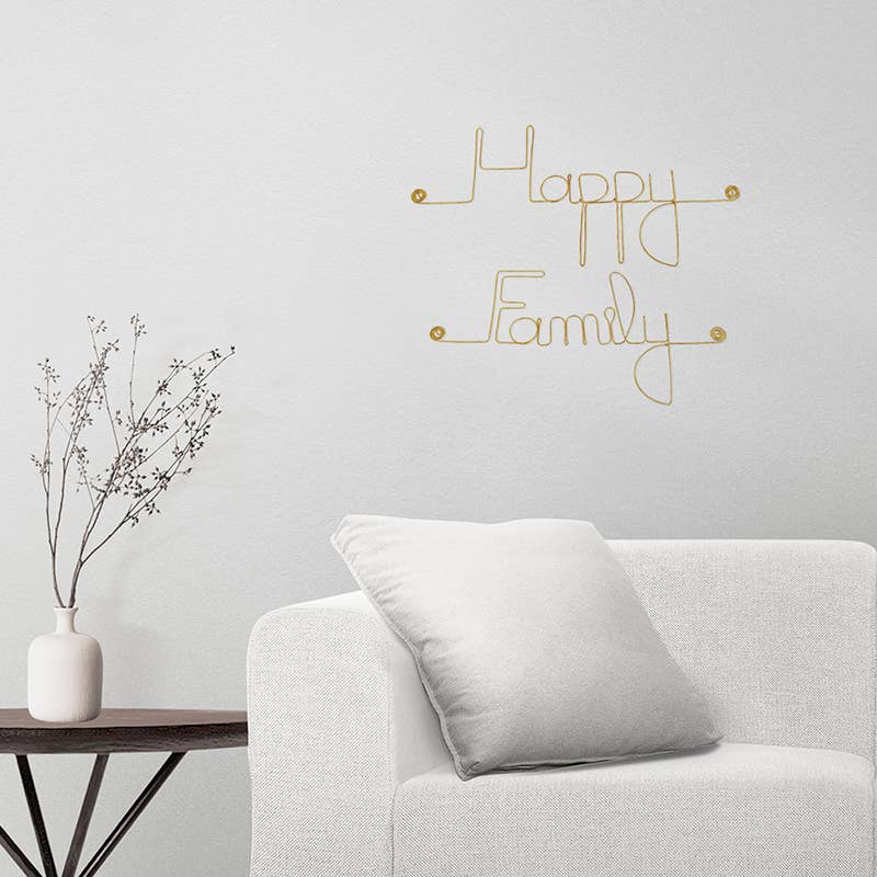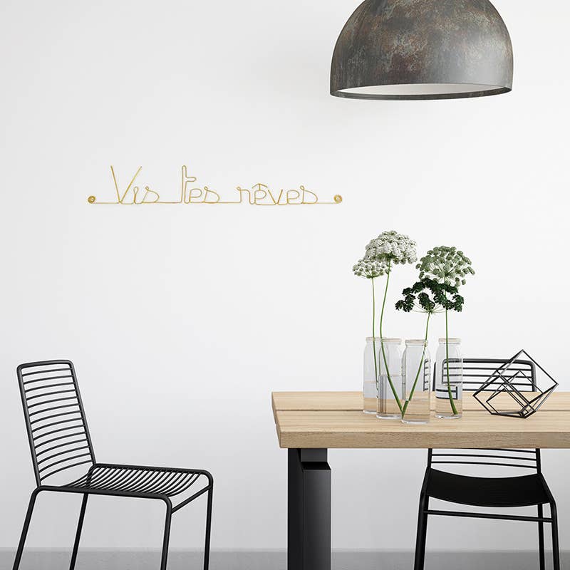 Golden brass wire writing to decorate the wall of a room in the house. Simple message in golden brass wire “Cultivate happiness” - to be pinned - Wall jewelry Indoor wall decoration for a living room, living room, bedroom,... Artisanal and French manufacturing 🇫🇷. Arts and crafts. Presented in a pretty pouch Gold pins provided for fixing. Anti-corrosion treatment. Wall jewelry and if the walls wore jewelry... Dimensions: Line 1: about 35 x 8 cm Line 2: about 44 x 8 cm Dimensions may vary slightly