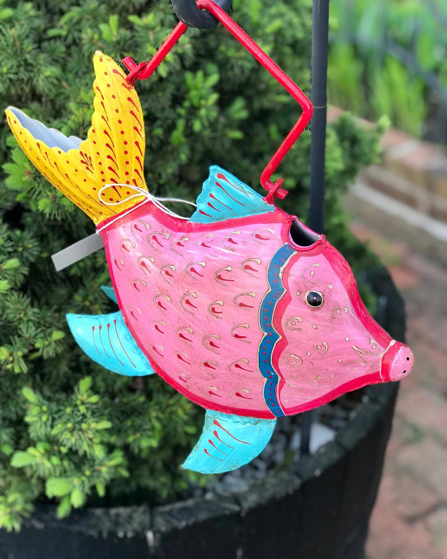 Introducing the newest addition to the Plant Pal family - the Red Bandana Duck Water Can! Hand-crafted in India by skilled artisans, this water can is made of sturdy sheet metal and features a striking red and blue design with intricate henna details. Not only is this water can a functional tool for watering your plants, it also doubles as a stylish planter or fresh flower container. The watertight construction ensures that your plants stay hydrated without any messy leaks. Measuring 16 x 3.75 x 11" high, the Red Bandana Duck Water Can is a great size for any indoor or outdoor garden. The solid metal handle provides a sturdy grip, making it easy to carry and pour water. Whether you're a seasoned gardener or a plant newbie, the Red Bandana Duck Water Can is sure to become your go-to tool for all your watering needs. With its unique design and versatile functionality, it's the perfect addition to any plant lover's collection. Perfect for Spring, Valentine's Day. Easter, Mother's Day.