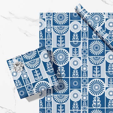Blue Flower Folk Art Recycled Wrapping Paper Sheet