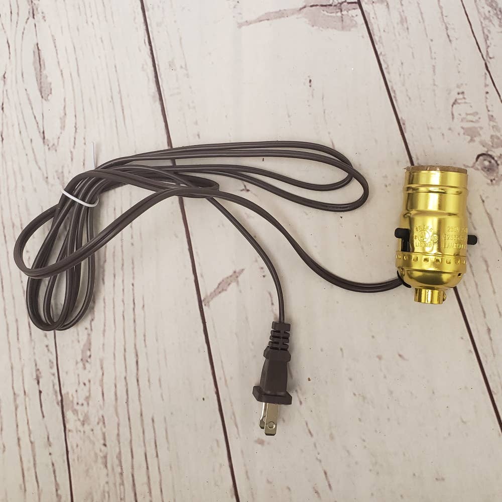 Create your own custom lighting with this Antique Brass Metal Electric Lamp Wiring Kit! Whether repairing a vintage lamp or building a new one from scratch, this DIY kit provides the essential electrical components for your project. Cord: 6 foot long gold cord Socket: 1-1/4 inch long For a candelabra base bulb (not included) UL listed With an antique brass finish, a six-foot gold cord, and a rotary switch on the cord for easy operation, this kit is designed to fit a candelabra bulb. Perfect for DIY enthusiasts and lamp restoration projects. UL listed.