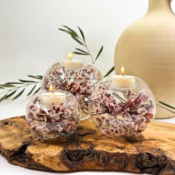 Add a touch of elegance to your product line with our Saku Hana Tea Light Candle Holders. Each clear glass sphere houses beautiful dried flowers, arranged by hand, ensuring a stunning and permanent display. These candle holders are designed to add charm and tranquility to any space. - Dimensions: Large - 14" D x 4.5" H, Medium - 12.5" D x 3.75" H, Small - 10" D x 2.5" H - Clear glass spheres - Choose from Cherry Blossom (Multi color), White and Coral Pink Flowers - Included tea light candles are in a clear plastic casing for a seamless look - One order includes 3 candles *Please note, the flower arrangements will vary.