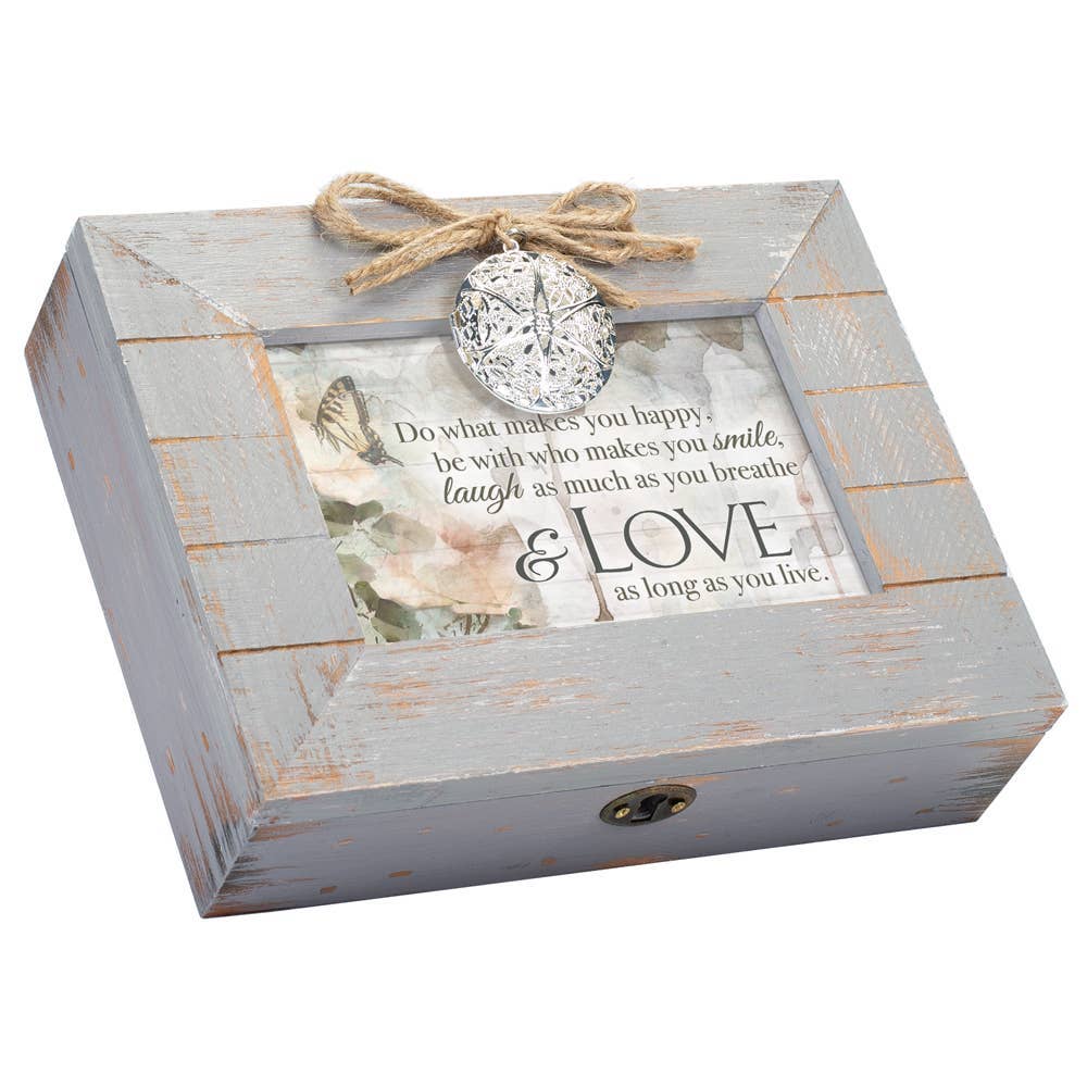 Rustic style musical keepsake box, made of wood, features a plank design with weathered gray finish. Silver metal round locket with jute bow accents the lid; locket opens at side to hold a 1-1/4 round photo. The hinged box lid is also a photo frame; comes with a lovely art print that reads: Grandmas can see what is invisible to the eye becAuse they look with their heart. Print is under glass. It can easily be changed out for a favorite 6 x 4 photo; removable back is underneath lid. Vintage style lock and key ensure your keepsakes are secure. Inside box is a compartment for the Sankyo musical movement with wind-up key. Plays the song: Edelweiss. Overall box size about 8-1/2 x 6-1/2 x 2-1/4. Pads on bottom of box help protect furniture.