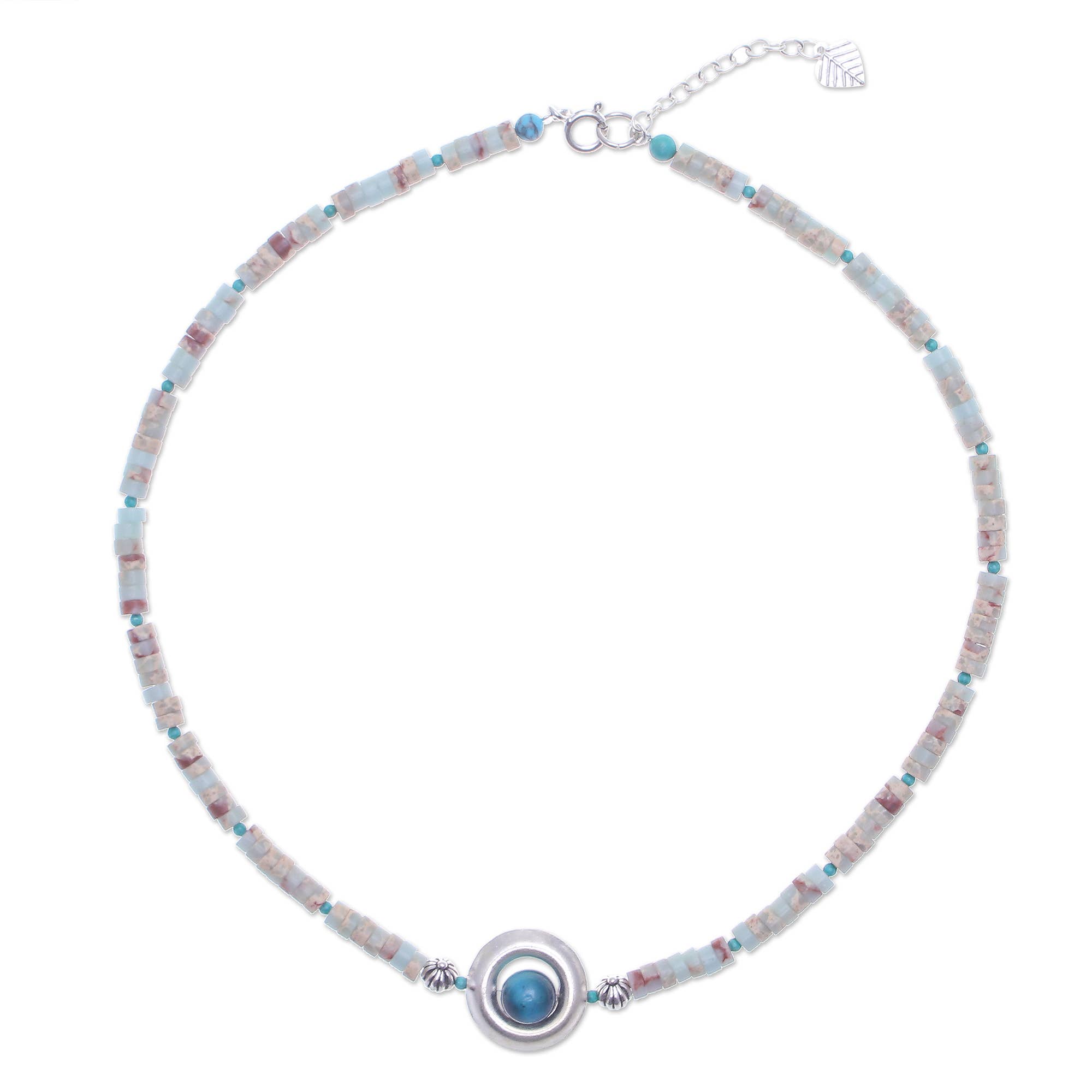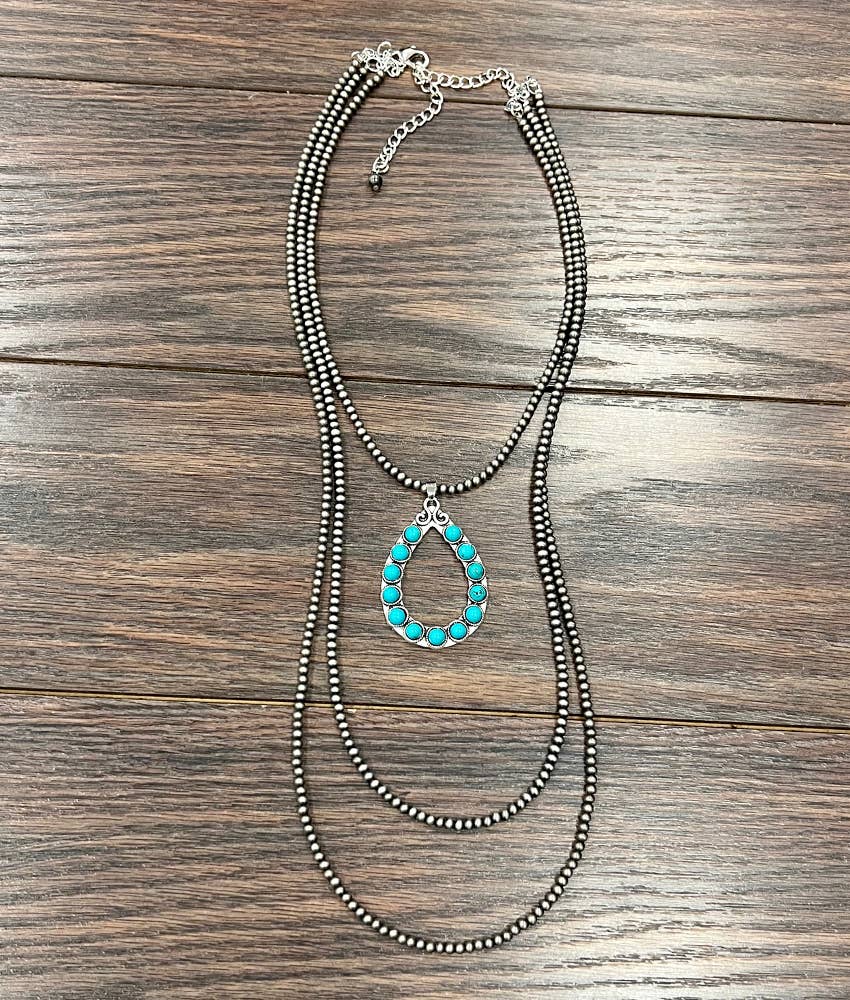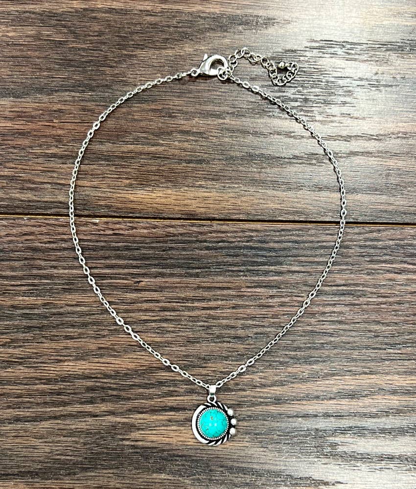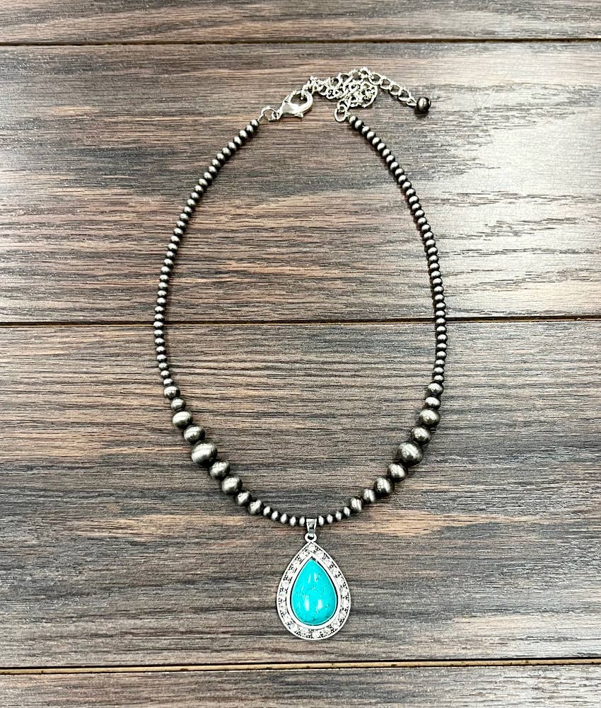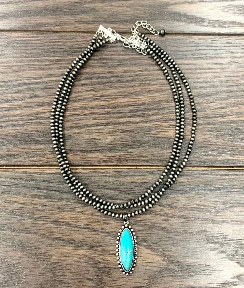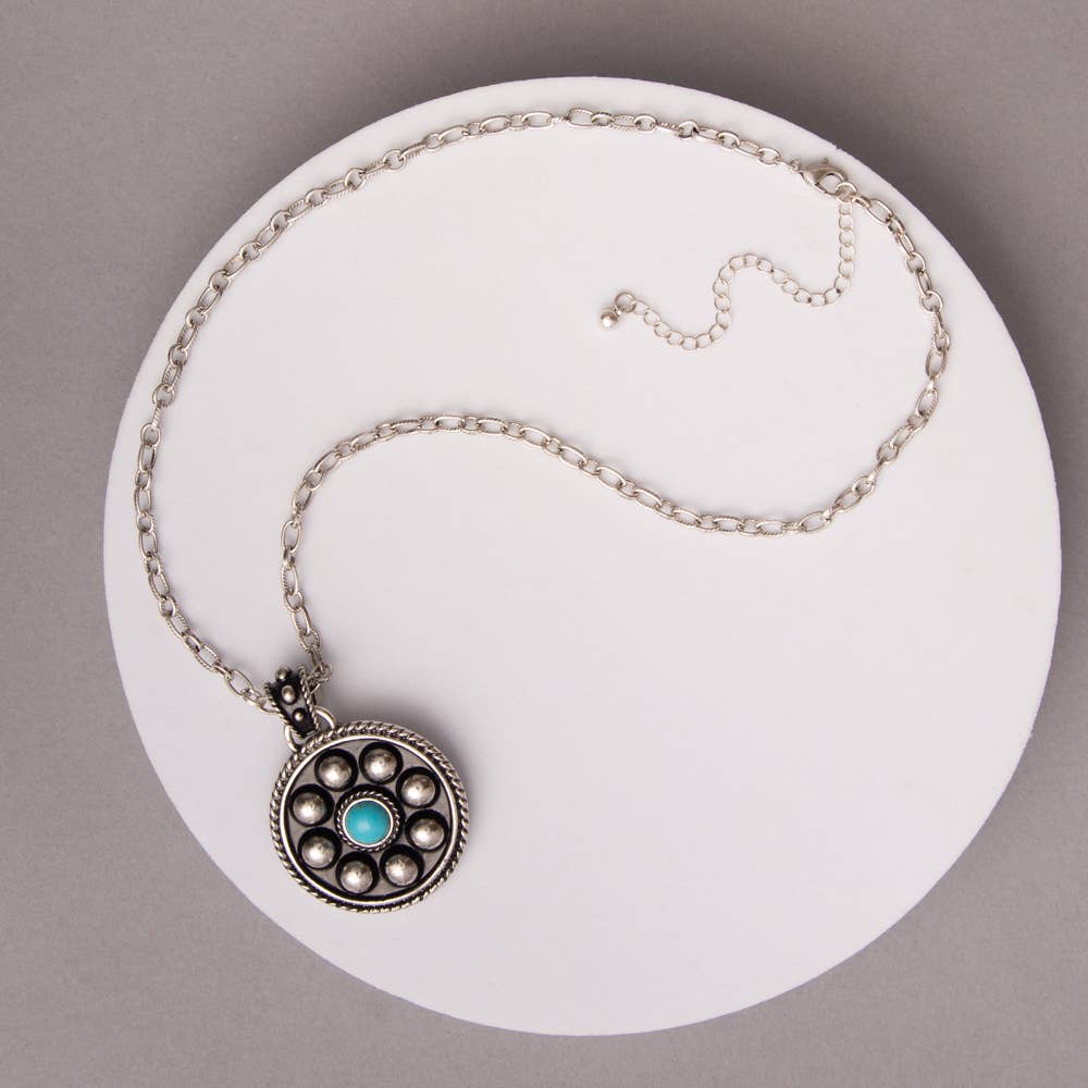 15" Long, Tiny 4mm Silver Navajo Bead Necklace, Brass Concho Turquoise Pendant * Natural stone may vary in size, color or shape * 15" long necklace & 5" extender * 4mm navajo bead necklace * 0.8" pendant on brass, antique silver plate * 12 grams weight * Nickel, Lead & Chrome free