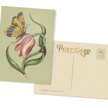 A postcard with a Nevada desert theme featuring the state shape bordered with sagebrush and a little bluebird hand drawn with ink and watercolor. Great for postcard exchanges, keeping in touch, collecting, and they fit into a standard size frame. The postcards measure 4" x 6" and have a matte finish. On the back is the title of the postcard (just an example is shown in the photo)