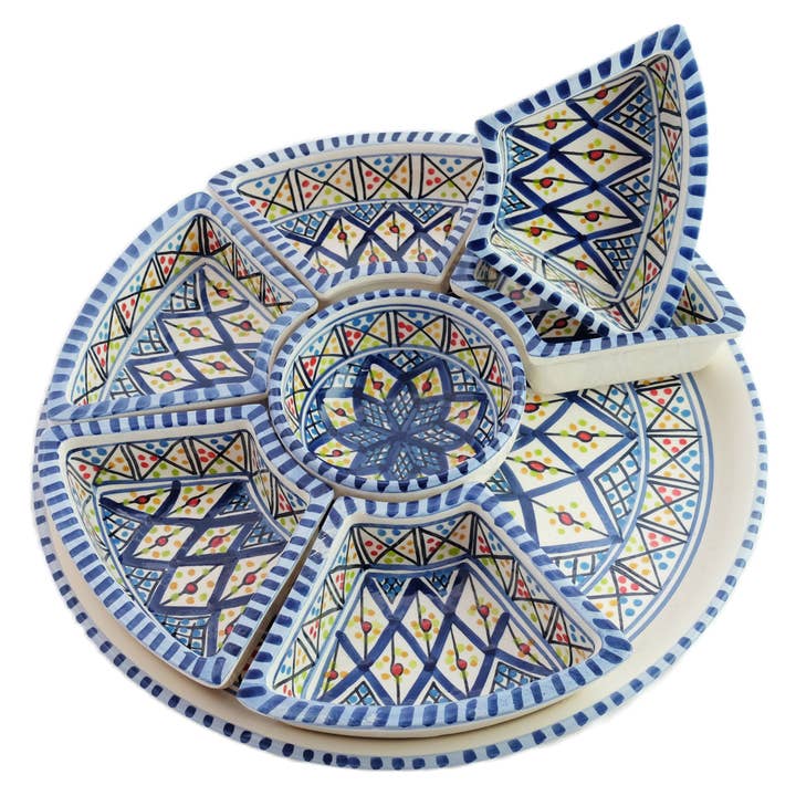 Chic ceramics hand-painted dinnerware for your store. Our Hand-Painted Ceramic Tapas Chip & Dip Taco Server, ideal for get togethers and gatherings. Nested serving set with 7 small bowls on a hand-painted platter Freehand painted Food safe paint and glaze Microwave and dishwasher safe Made in Tunisia This exquisite serving set is produced by the Tunisian artisan studio. This server makes a unique kitchenware gift for hosts or a charming housewarming present. Perfect for holiday gatherings and entertaining.