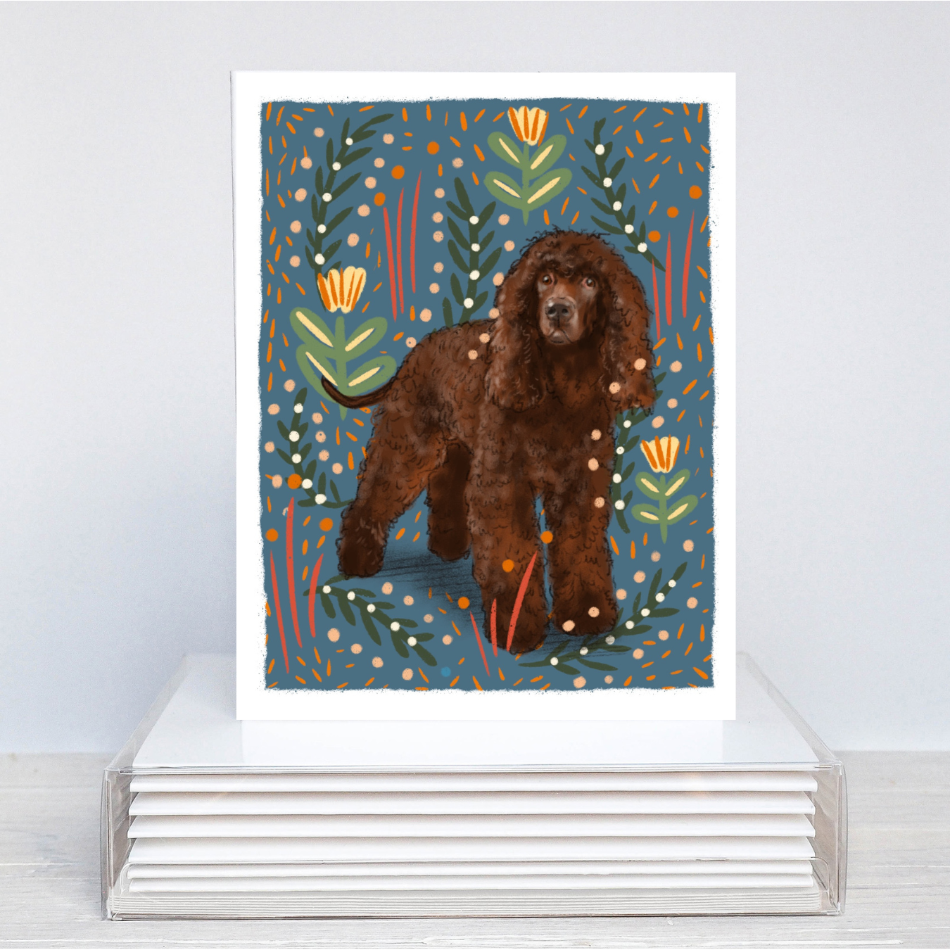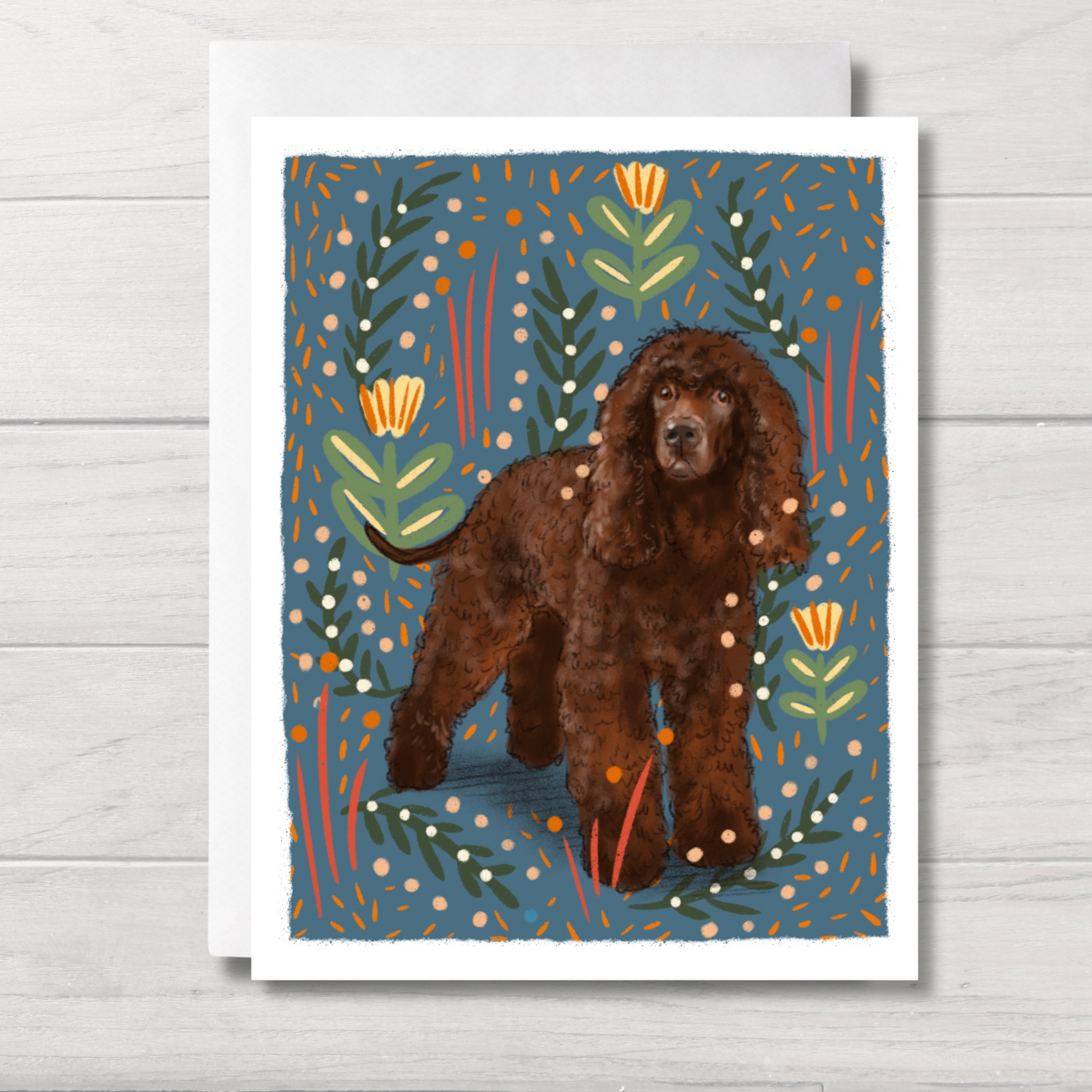 Send your thoughtful messages with these Irish Water Spaniel note cards! Using quality card stock and our original artwork, your friends and loved ones will be delighted to receive a handwritten note delivered with a pup-inspired touch. These flat note cards measure 4.25 x 5.5 inches and come packaged in a cellophane sleeve. Each pack has 6 flat note cards and envelopes.