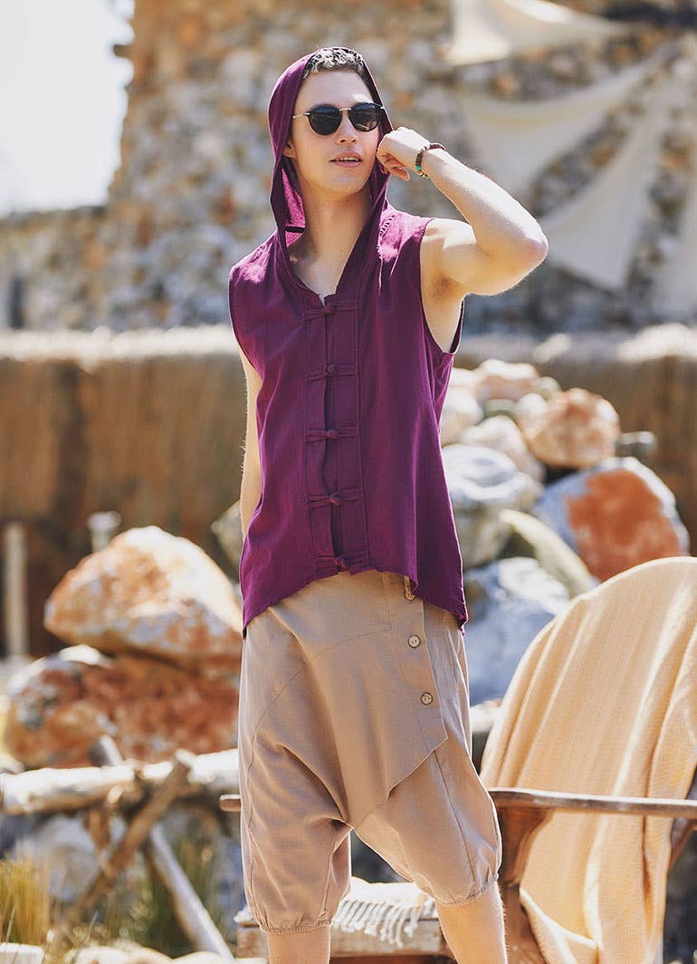 BohoClandestino - Wholesale Button Down Shirt - Men's - Maroon Sleeveless Knot Button Men's Shirt0