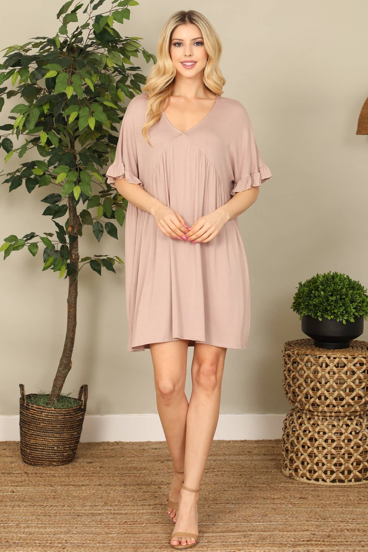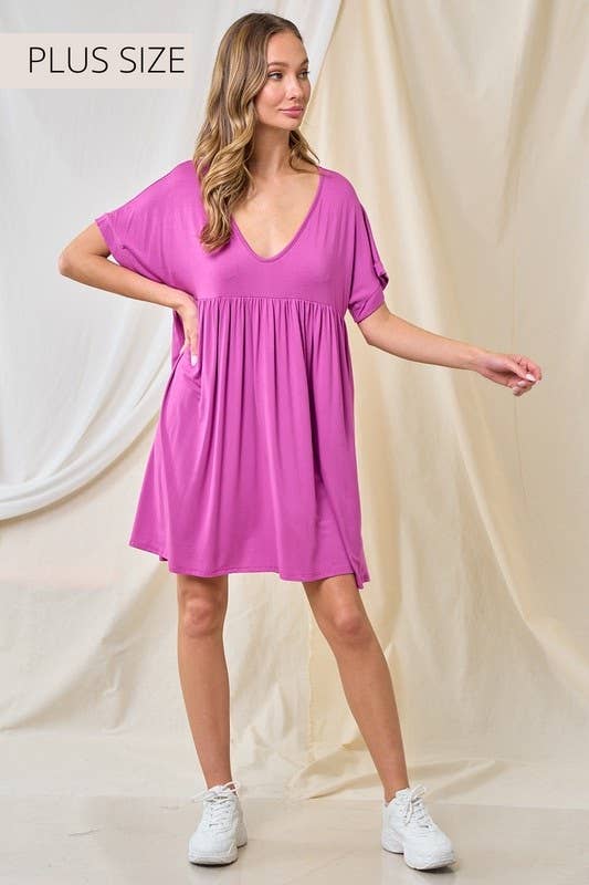 Style # BD2972X Stay effortlessly stylish and comfortable with this plus-size cap sleeve pocket mini dress. Designed with a relaxed fit, this dress is made from a soft, breathable fabric that drapes beautifully, ensuring all-day comfort. The V-neckline adds a feminine touch, while the rolled cap sleeves create a laid-back, casual look. Functional side pockets add convenience, making this dress perfect for running errands, lounging, or dressing up for a day out. Pair it with sneakers for a casual vibe or accessorize with sandals for an elevated yet easygoing style. -Soft and lightweight fabric for breathable comfort -Flattering V-neckline for a feminine touch -Rolled cap sleeves for a relaxed, stylish look -Functional side pockets for added convenience -Loose and flowy silhouette for easy movement -Versatile design for casual or dressed-up occasions plus size mini dress, cap sleeve plus dress, pocket plus dress, relaxed fit plus dress Model is 5' 8" and wearing a 1X.