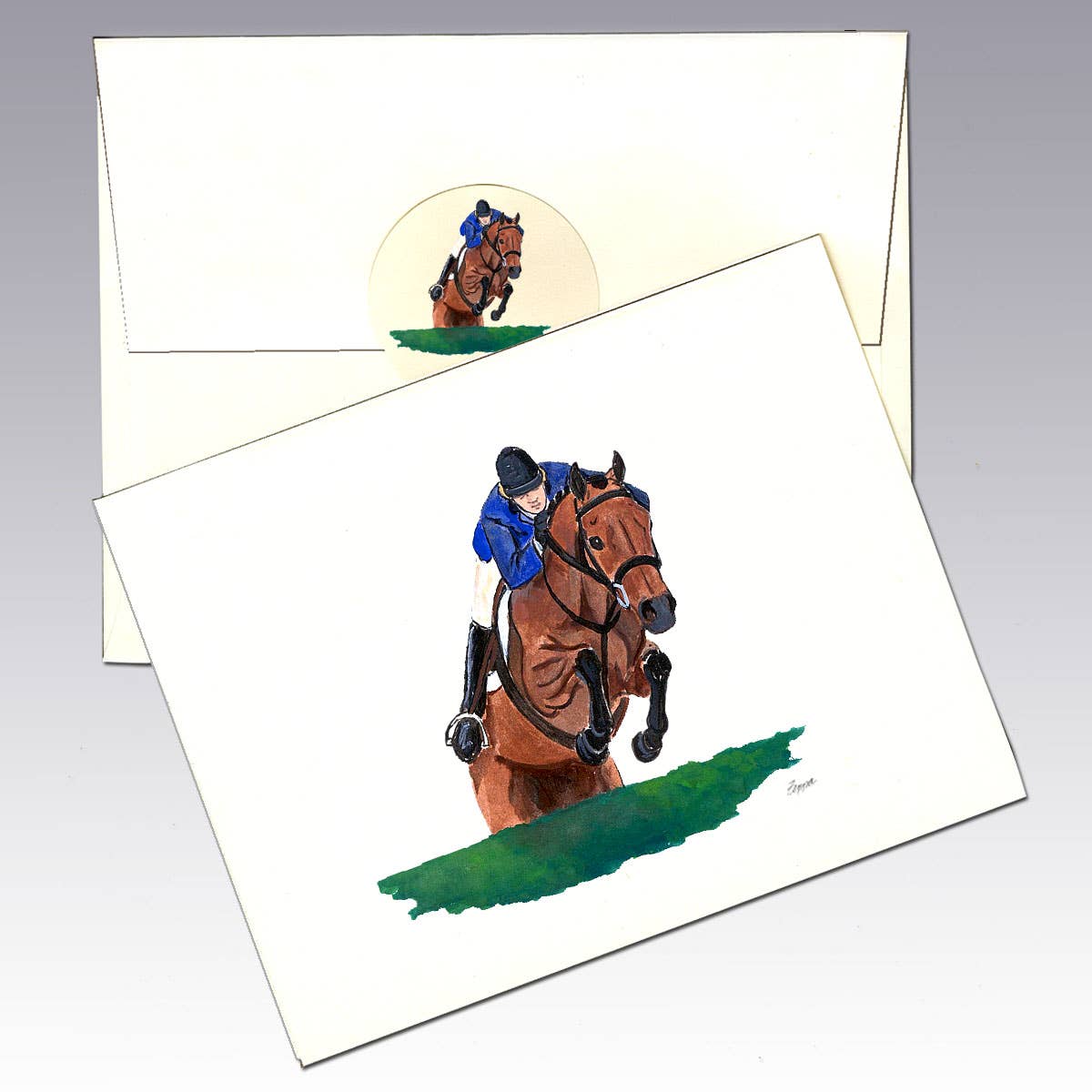 A box of 8 cards, envelopes and matching seals featuring a lovely painting of a couple Polo players. Each box of cards is printed in our SW VA studio and assembled by hand.