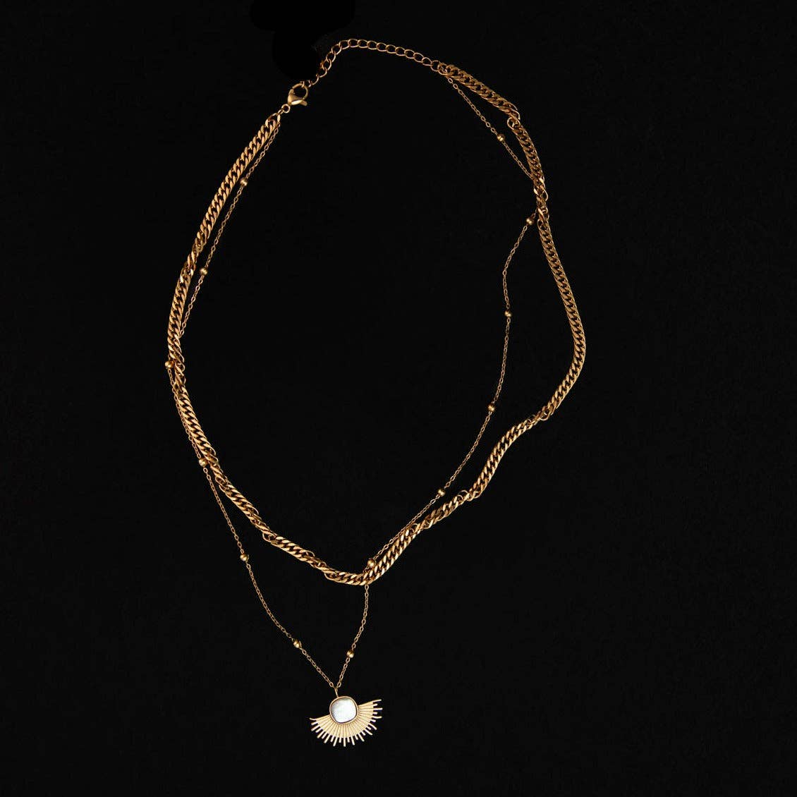 Layering is super in and this necklace is a two in one! This double layered 18kt gold plated stainless steel necklace features a 16 inch dainty metal fringe chain with a 20 inch chain and vertical bar pendant. This necklace will make any outfit look put together. Named after an incredible best friend, this necklace is all about celebrating the bond that makes life brighter and the cherished memories shared with a soul sister. * BEST SELLER * 18kt gold plated stainless steel * 16 inches/20 inches * Nickel free