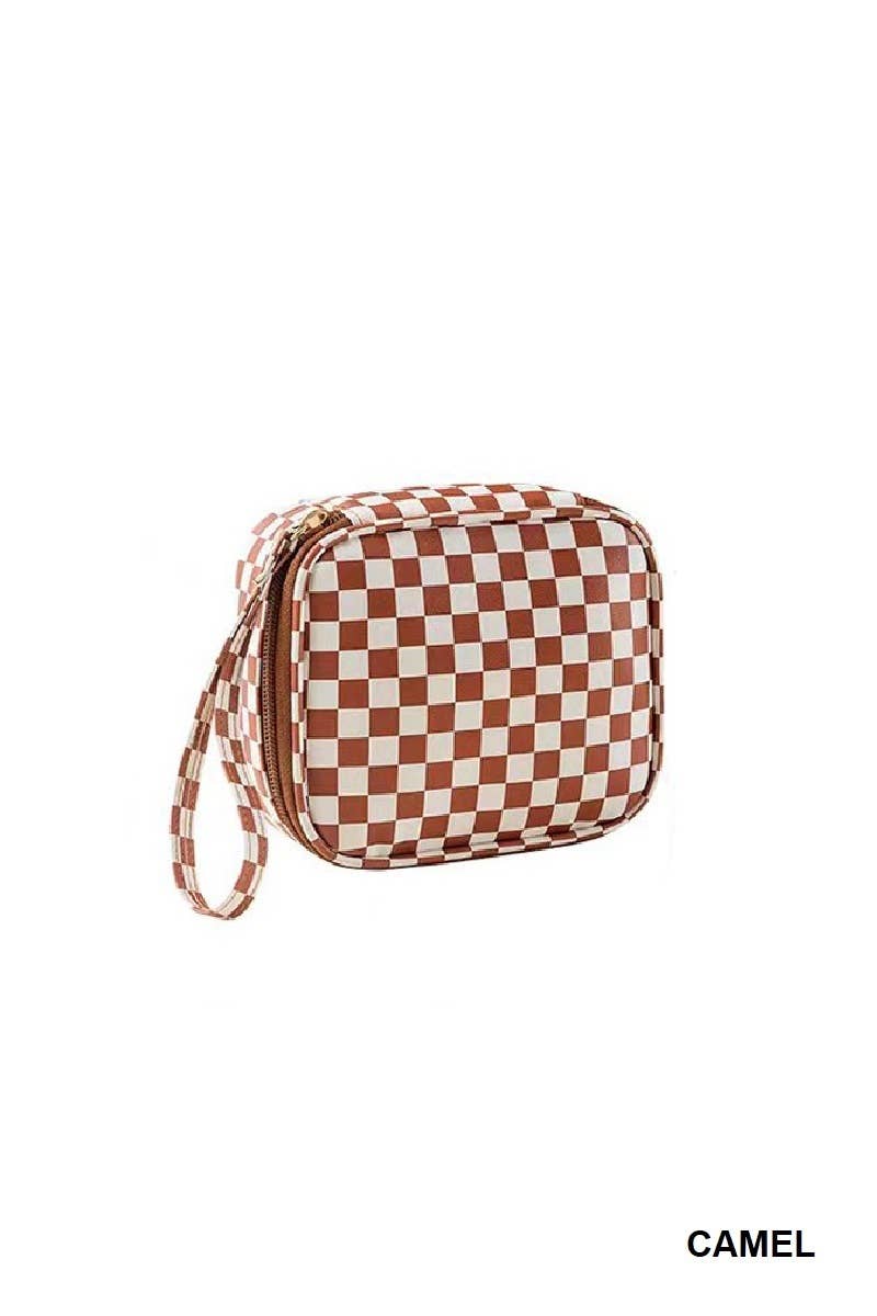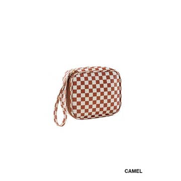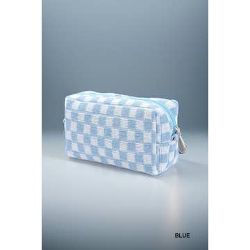 This handy cosmetic bag is in checkered pattern knitted material. Light Vinyl lining inside. Absolutely adorable! Dimension: 8” x 4” x 3”
