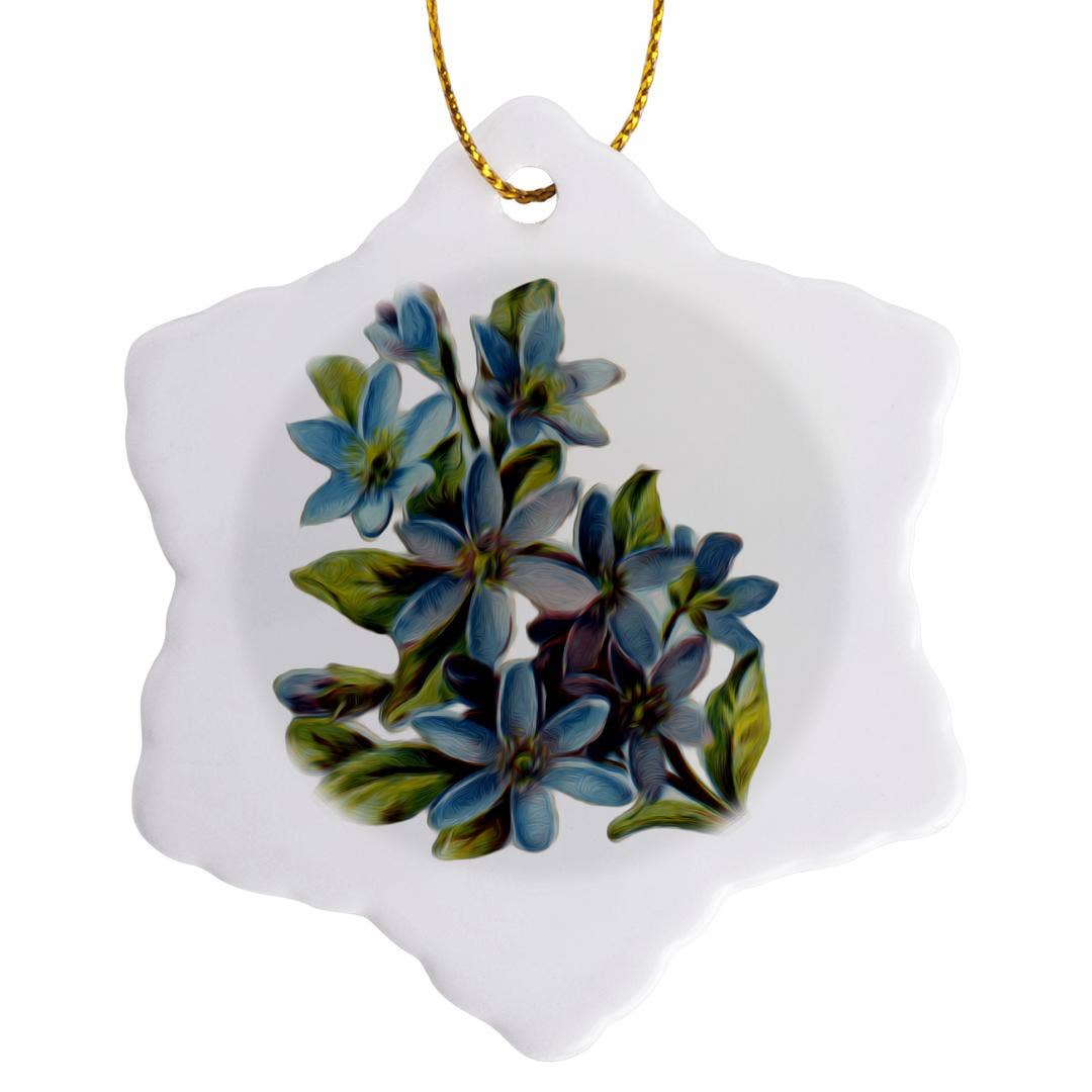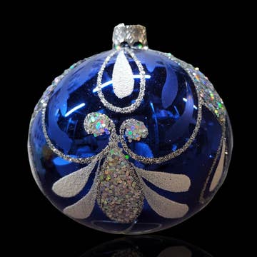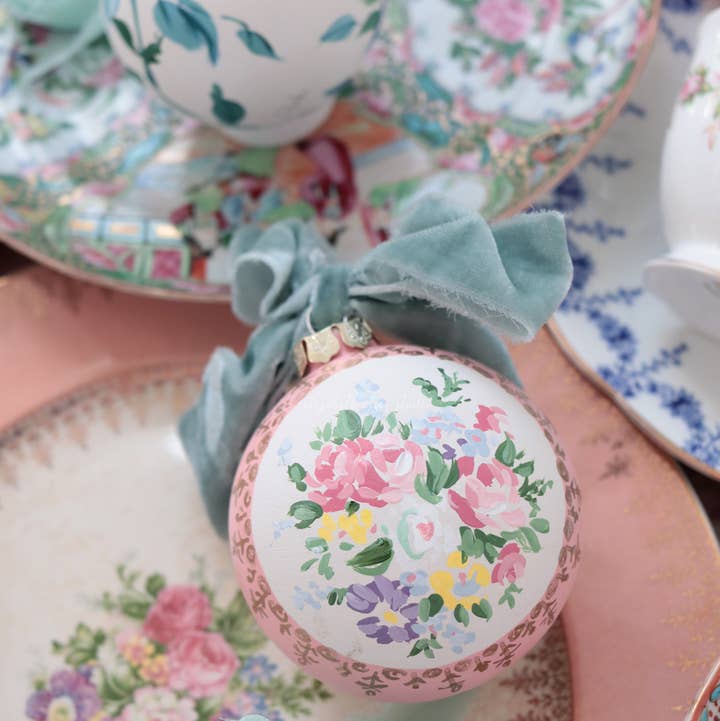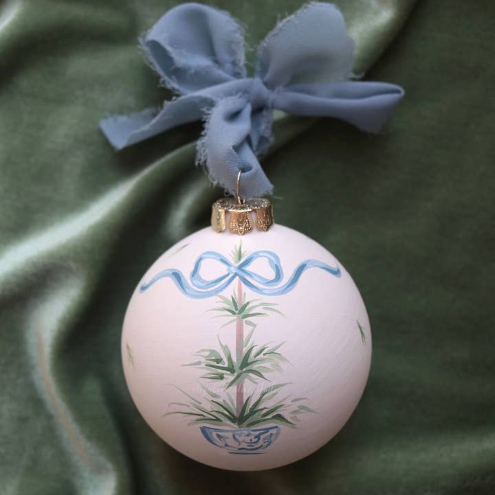 Inspired by my collection of vintage dishes, this hand-painted ornament adds classic chinoiserie style to your Christmas tree. A peacock and peahen sit among peony blooms and cherry blossoms. Shades of light blue and accented with metallic gold. This 3" ceramic ornament is painted by Elizabeth and signed, then topped with a luxurious chiffon ribbon.