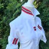 Our Casie 2 white oxford cloth shirt is adorned with striped ribbon on the placket, the cuff, and the back of the collar. So you can wear it down for subtlety or popped for drama! White Oxford w/Red, White & Black Stripe Ribbon SIZING INFO *OXFORD shirts have a slightly contoured fit* XS S M L XL XXL 3XL 0/2 4/6 8/10 12/14 16/18 20/22 24/26 32-34 35-36 37-38 39-41 42-44 45-47 48-51 *Please measure at the fullest part of the bust. You can also lay down your favorite shirt and measure across 1" BELOW the armhole XS S M L XL XXL 3XL 18 19 20 21 1/2 23 24 1/2 26 1/2
