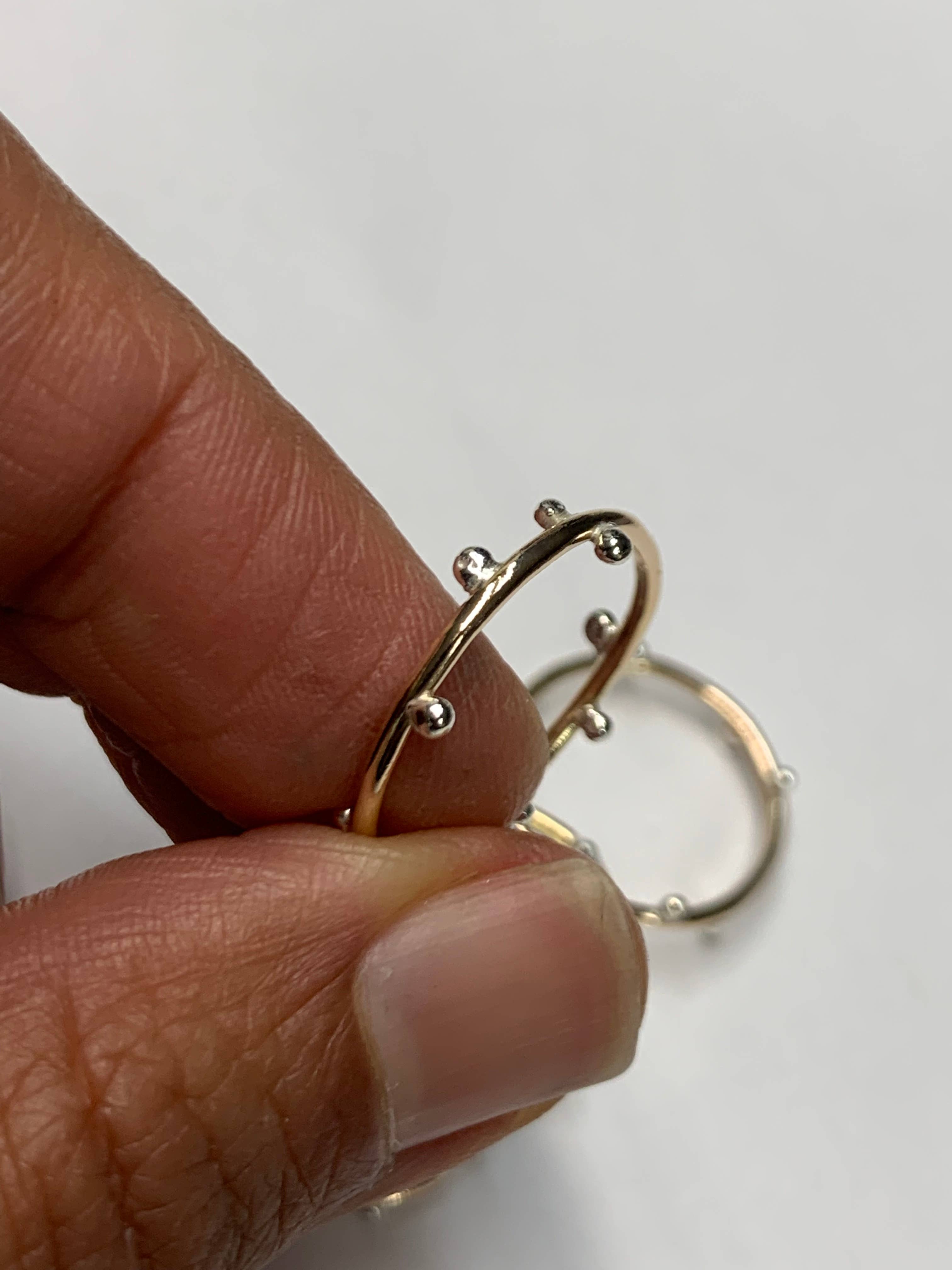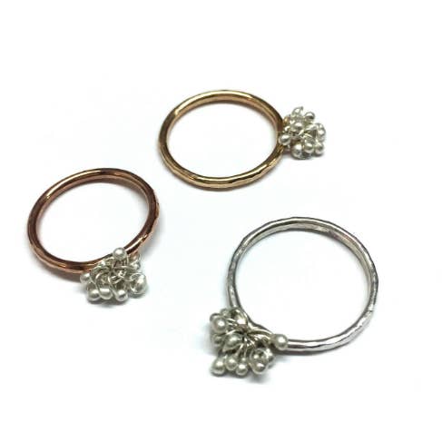 Our What's Inside Ring is fabricated from hammered precious metal. So Sweet! Small Sterling Silver balls are soldered in place. Negative space displays your beautiful skin juxtaposed with silver or gold (or both) framed treasures. Dimensions: 3/4 inches tall 5/8 inch wide *Sturdy yet delicate *Unique metalwork design and technique *Created in Portland, OR USA Finish: All Sterling Silver 14k Yellow Goldfilled 14k Rose Goldfilled Metal Thickness: 16 ga.
