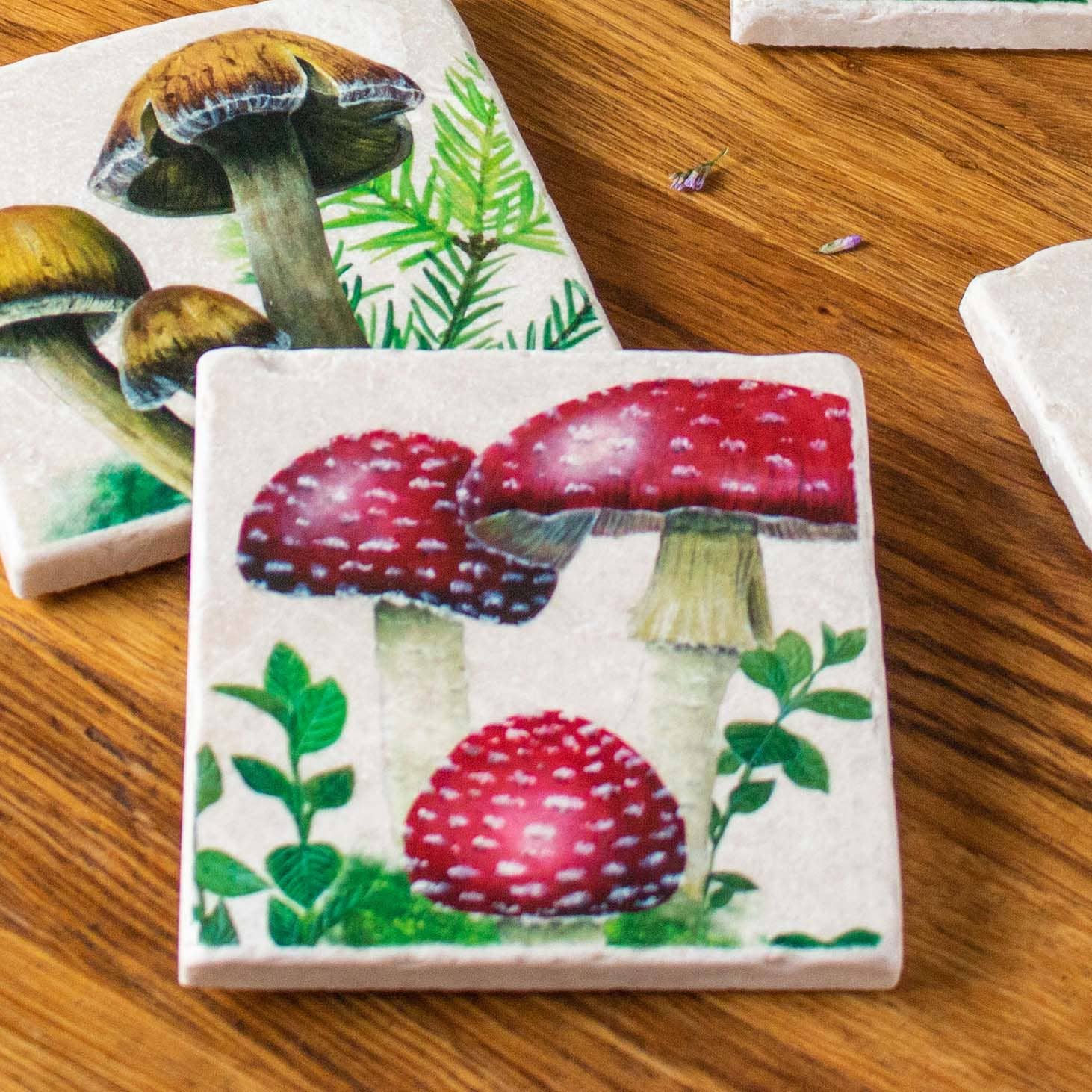 This digitally printed cotton tea towel is part of my 'Woodland Shrooms' collection. It is made from durable cotton fabric and features a range of mushroom illustrations: bright red Toadstools, yellow Chanterelles and Honeycups and burgundy red Winecaps against a warm sand coloured background. - Material: strong Cotton fabric (300 gsm) - Dimensions: 70x46 cm / 18x22 cm (folded) - Packaging: folded and wrapped with paper bellyband which contains care information The cotton fabric is a strong and durable material which can be washed at 40 degrees and steam ironed at medium heat. There is a practical hanging loop on the back as well as my 'AMPellegrini Art & Design' label. Each tea towel comes neatly folded with a paper bellyband wrapped around. There are more tea towels, stone coasters, fine art prints and greeting cards to discover which complete the whole 'Woodland Shrooms' collection.