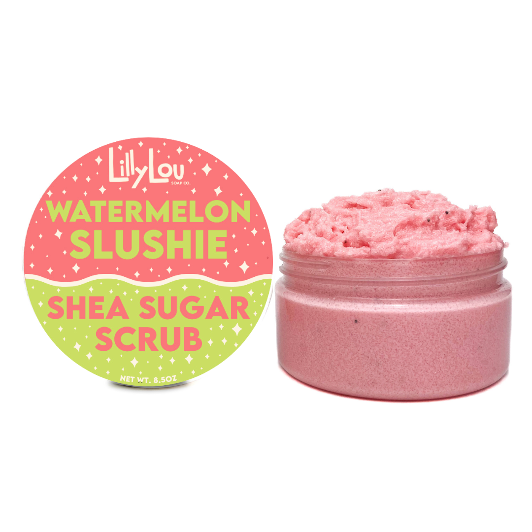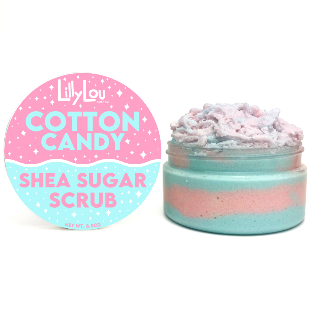 This shea sugar scrub has the sweet scent of fluffy cotton candy. Keep your skin exfoliated and moisturized the fun way! Ingredients: White granulated sugar, sunflower oil, fractionated coconut oil, shea butter, hemp seed oil, cetearyl alcohol, sodium lauryl sulfoacetate, fragrance, vitamin e oil, kaolin clay, optiphen, mica (titanium dioxide, tin oxide, ultra marine blue, iron oxide) Weight: 8.5oz All of our sugar scrubs are: -Cruelty-free- -Paraben free- -Handmade in small batches to ensure quality- -Made using natural ingredients- -Handcrafted in Vermont- -Made using high quality ingredients- Perfect for: Gifts for friends, Christmas Gifts, Secret Santa Gifts, Stocking Stuffers, Holiday Gifts, Gifts for her, Gifts for him, Easter Gifts, Birthday Gifts, Teacher Gifts, Shower Gifts, Bridal Party Gifts, Mother's Day Gifts, Father's Day Gifts Avoid contact with eyes. Not for consumption. Warning: Bathtub surface may become slippery.