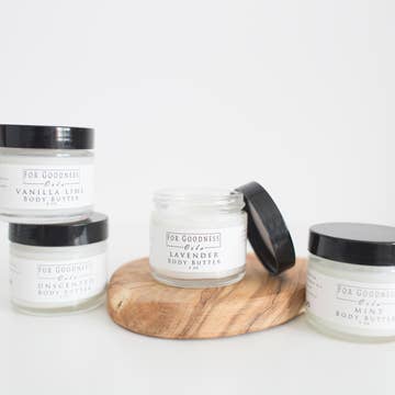 Our Lavender & Sage is a beautiful blend of herbs, lavender, and aromatic woods. Sage, rosemary, and chamomile awaken the earthiness of this scent, while hints of sandalwood and cedar are reinforced by clove, lavandin, and cedarwood essential oils. Soothe, nourish and protect your skin daily with our whipped body butters. Packed with essentials that your body needs to feel moisturized and hydrated. Made with Cocoa Butter, Aloe-Vera, Shea Butter, Coconut Oil, Vitamin E. Oil, Sunflower Oil and clean, skin-safe fragrance oils that are free from paraben & phthalates. Our butter blend is rich, creamy, hydrating and soothing for normal to dry skin with a dash of shimmer for that extra GLOW; never leaving a sticky or greasy film on the skin. Our body butters come with a wooden spoon for easy scooping. Just one small portion goes a long way. 4oz glass jars with metal white caps.