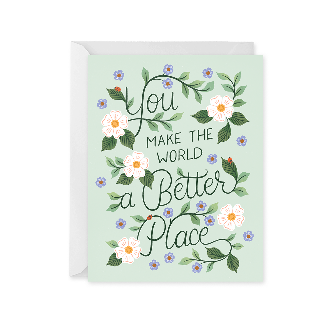 This cute Thank You card features a cozy latte in a teacup and saucer, surrounded by blossoms and leaves, and finished with a hand-lettered pun that reads "Thanks A Latte". - A2 Card measures 4.25" x 5.5" closed. - Blank on the inside for your sentiments. - Printed in the USA on 100% Recycled Paper. - Comes with fitted, matching white envelope. - Packaged in a clear, recycled cello sleeve.