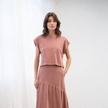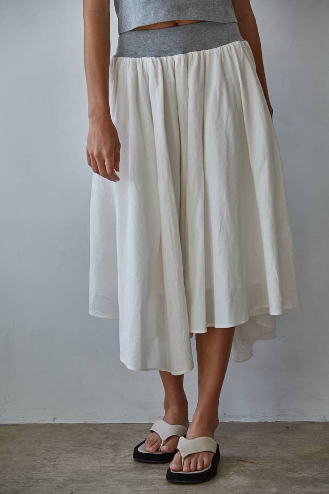 A solid woven midi skirt with the following features: Elastic waist with adjustable drawstring. Contrast piping with side zipper. Side pockets. Front-slit. Calf length. Relaxed fit. Model Info: Height: 5 ft 9 in | Bust: 31 in | Waist: 24 in | Hips: 34 in | Wearing Size S.