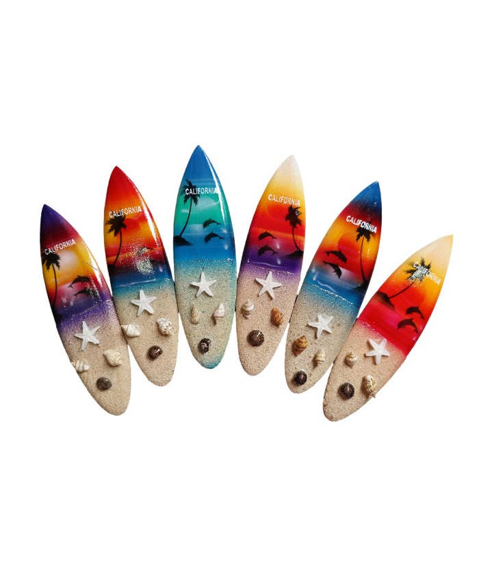 Celebrate the iconic Venice Beach with this 10CM surfboard magnet featuring a vibrant hibiscus flower design. Perfect for adding a tropical and coastal vibe to your fridge or magnetic surfaces. Available in assorted colors.