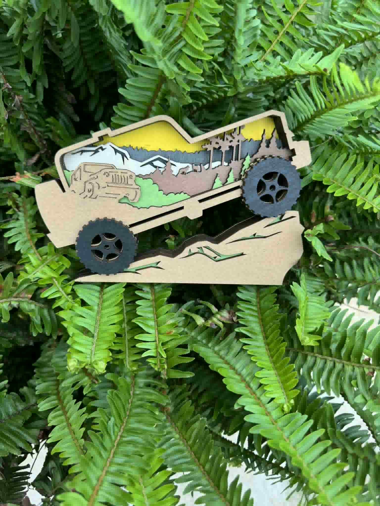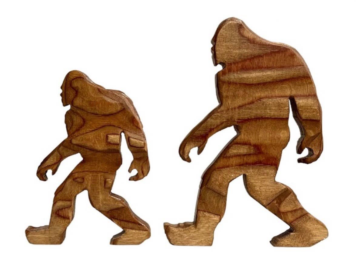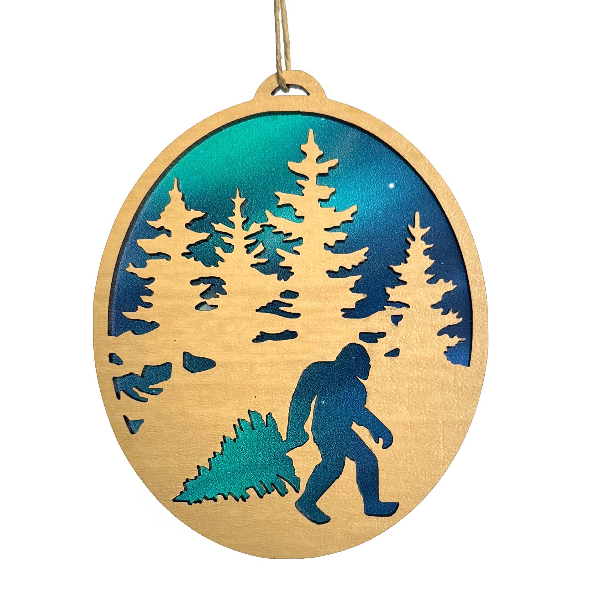 Layered wood design in the shape of Bigfoot. The inside scene depicts Bigfoot walking through a forest during a full moon in shades of blue.