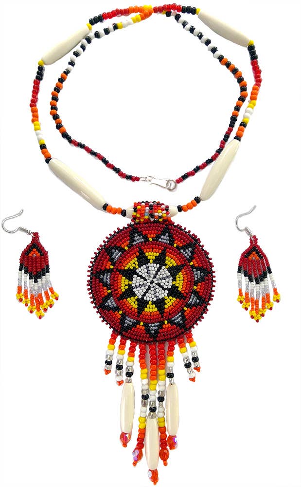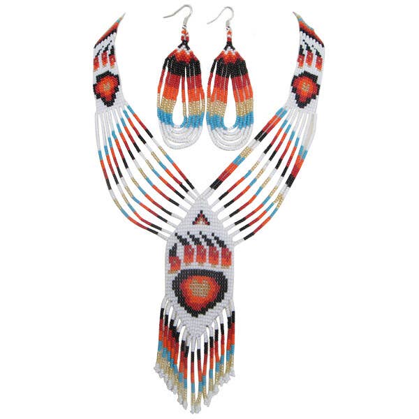 Wholesale Handmade Beaded Feather Design Layered Necklace Earrings Set in Cyan Blue, White, Red, Black, Yellow