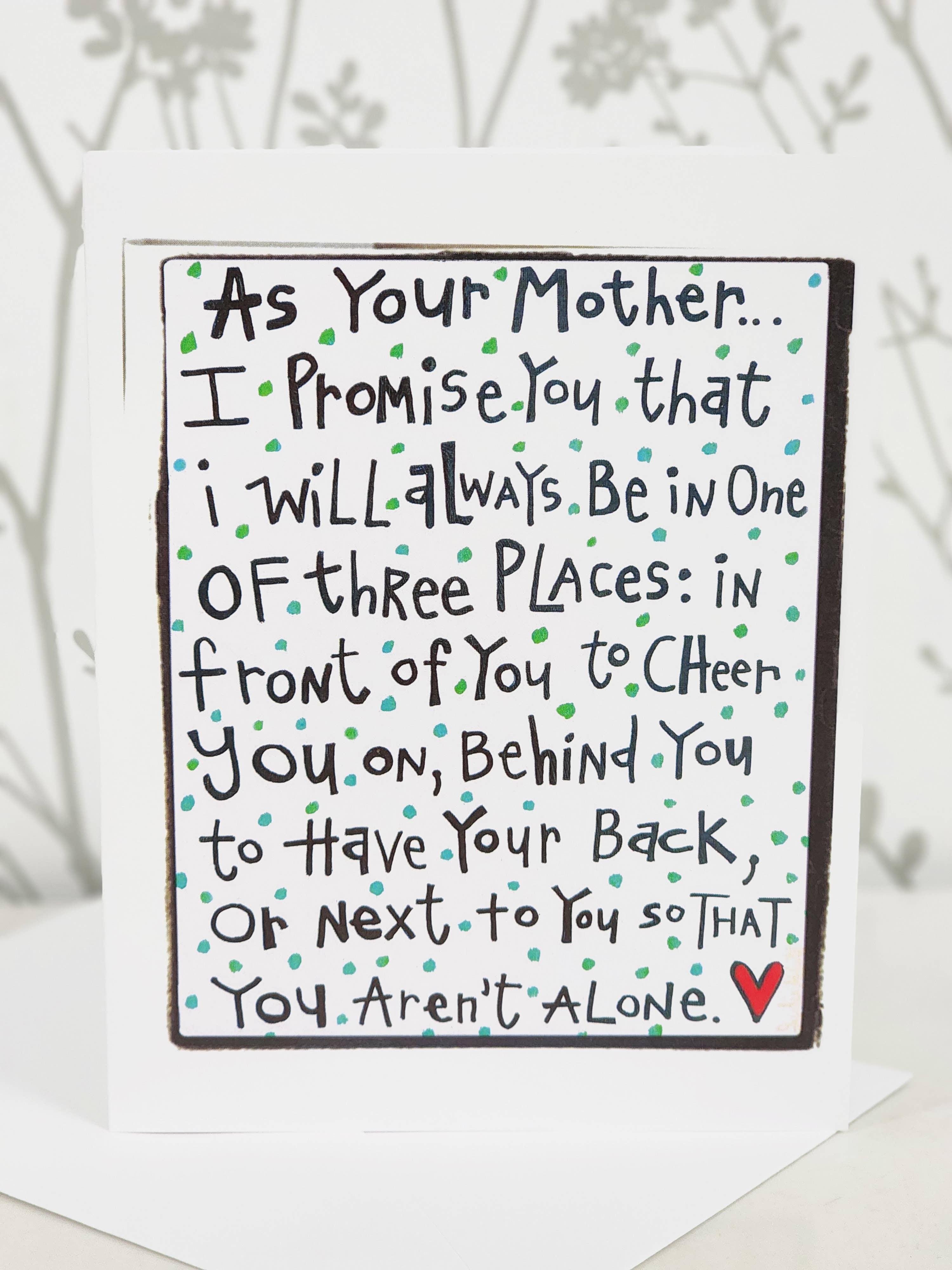 Our As Your Mother Pillow is the perfect finishing touch for your home or to give to someone special. The 100% cotton canvas pillow features artwork "As Your Mother I Promise.... You Are Not Alone". The pillow has a zipper closure. Our pillows arrive with a pillow insert. Made in the USA. Dimensions: 18" W x 18" H. Material - C: 100% Cotton; F: 100% Poly. Care Instructions - Machine wash cold. Air dry or tumble dry low. Safe to iron.
