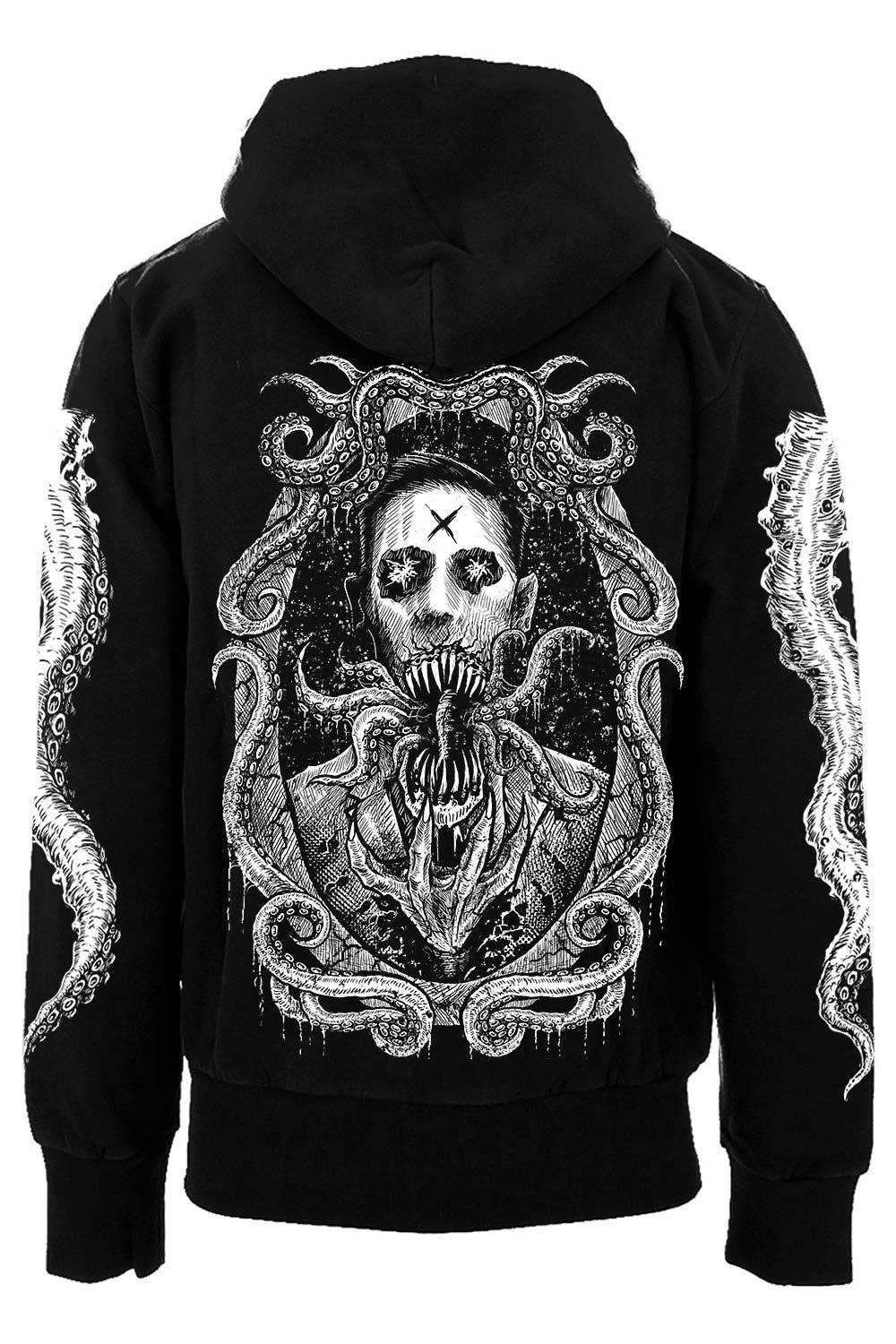 And upon that midnight hour so dreary, a possession came over the poet. Up from the deep bleak of forgotten waters, Cthulhu rose from the black waves to feast on Lovecraft's flesh and soul. - Zipper Hoodie * Call of Cthulhu Hoodie. * Tentacle Sleeves [Optional]. * Distressed Details. * Front Zipper, 2 Pockets, & Hood. * Graphic on Back. * VampireFreaks Logo on Chest. * Comfy and Cozy. * Handprinted & Hexed in the USA! * 100% High-Quality Cotton. - Pullover Hoodie * Call of Cthulhu Pullover. * Tentacle Sleeves [Optional]. * Distressed Details. * Sizable Front Pocket & Hood. * Graphic on Front. * VampireFreaks Text Logo on Back. * Comfy and Cozy. * Handprinted & Hexed in the USA! * 100% High-Quality Cotton. Size Chest [inches] S 34-36 M 38-40 L 42-44 XL 46-48 XXL 50-52 3XL 54-56 4XL 58-60 5XL 62-64