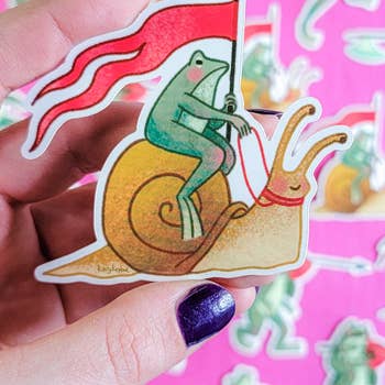 Now this is a strange fellow. A fox-like creature in a snail shell, blowing a long trumpet. Inspired by medieval manuscripts and a perfect friend to add to your laptop or water bottle sticker collection. Material: Water/weather-resistant high-quality vinyl printed with eco-friendly ink. Smooth matte finish. Good for indoor or outdoor use. Available with or without plastic packaging. Size: 3.5”x1.75” Made with love in the USA. Designed in Rhode Island and manufactured in Vermont.