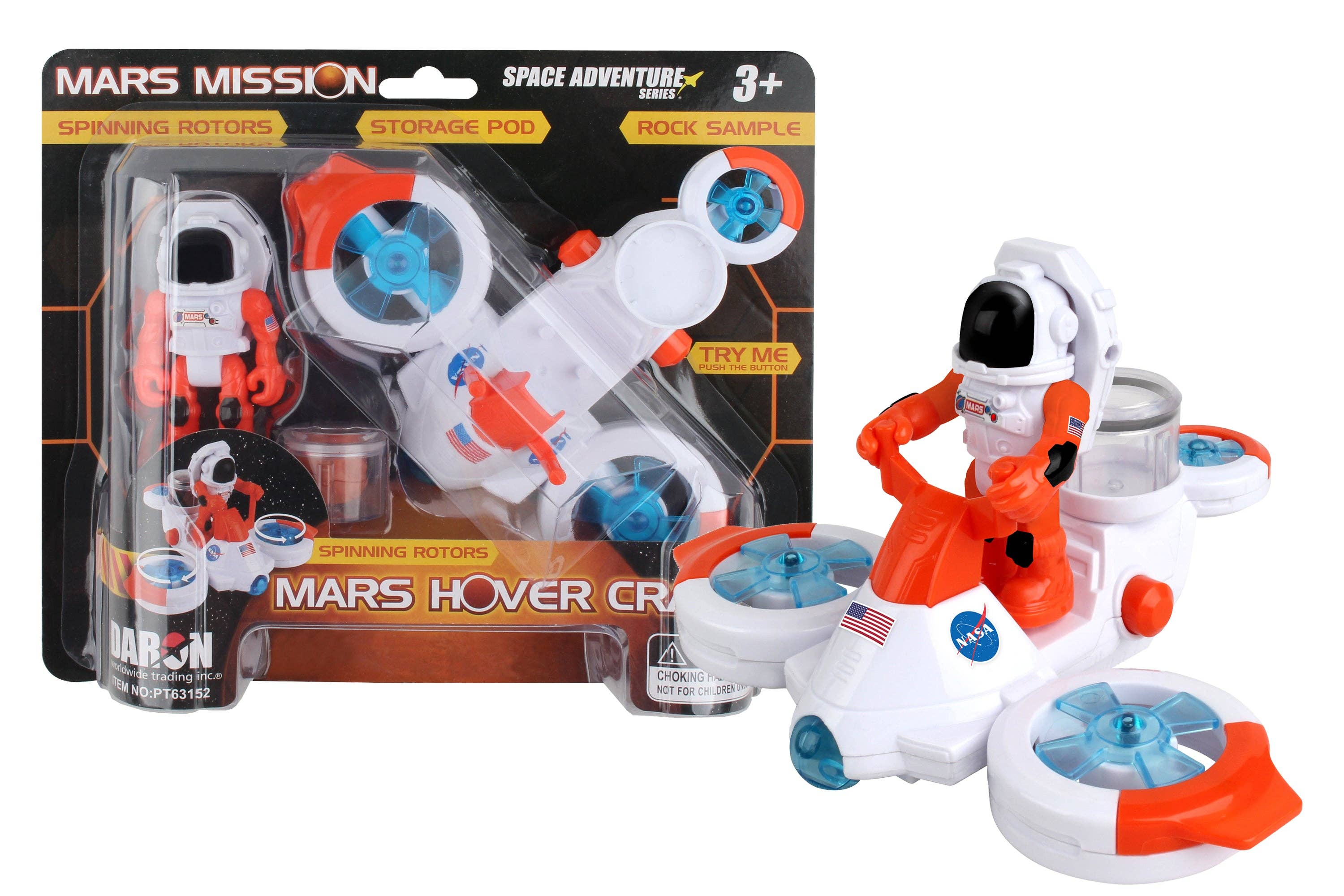 Includes Rover, Astronaut with space backpack, rolling wheels, cockpit hatch, hidden compartments (camera pod, satelite dish, solar panels, sensor). Ages 3+