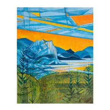 Everyday greeting card featuring a landscape with rolling hills, mountains, and rising sun. This is a print from an original hand-tinted paper collage artwork. The original art has been scanned and then printed onto archival paper. Cards are blank inside to add a personal message. Each card comes with a white envelope and is wrapped in a clear sleeve.