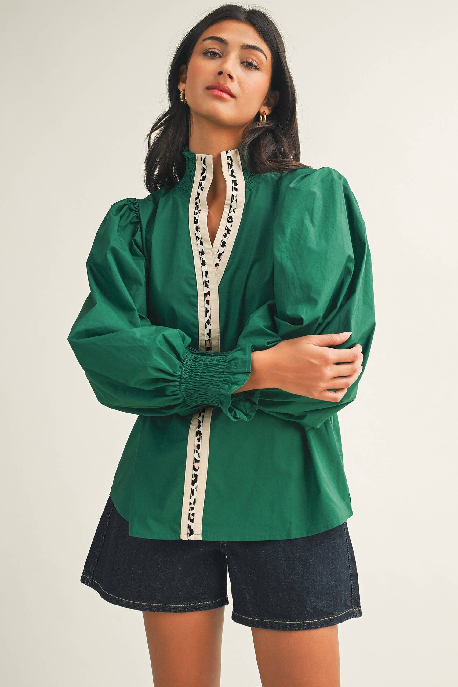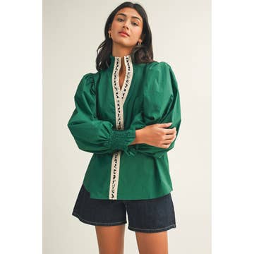 Round Neck Button Down Puff Long Sleeve Satin Top Model Height: 5'8" Wearing Size Small