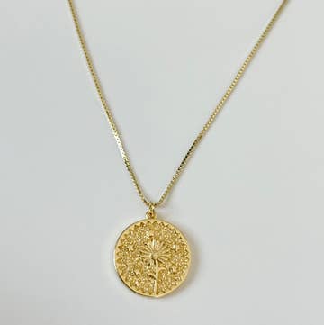 vintage wallpaper/resin, gold-plated 10mm bezel, 2mm gold-plated brass satellite chain, lobster clasp. A minimalist gold necklace with playful elegance. The tiny pendant measures approximately 10mm and features a whimsical gold colored flower on a creamy background. Each necklace is one-of-a-kind as these are repurposed from original vintage hand screened wallpaper - no two are exactly alike which is part of their charm! Each illustration is sealed within a 10mm gold-plated pewter bezel under layers of doming resin that serves to protect and to magnify the image. Pendants dangle from a petite 2mm gold-plated satellite chain (so delicate!) measuring approximately 18” with a small gold-plated lobster clasp closure. A perfect layering piece that looks great with other necklaces and just as fabulous on its own. Comes packaged in a branded 'envelope' that's easy to display. Let me know if you would prefer without.