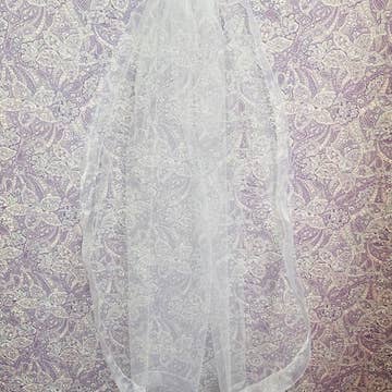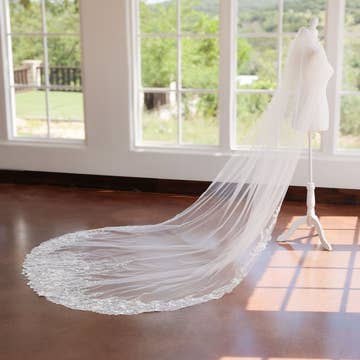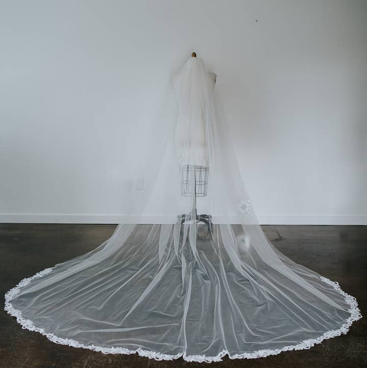 No bridal look is complete without a veil! This gorgeous Cathedral length handmade veil will be the finishing touch on your wedding day. This high quality veil is handcrafted and has a beautiful lace edge.  It's a beautiful addition on your wedding day! 3m long, 1.5 wide, off white, wire comb -- We know firsthand that a bride feels their best when they look their best. The importance of a simple piece, such as a veil, belt or headpiece can not go understated, and will spruce up your gorgeous wedding dress in a way that will make you feel beautiful! The moment you put on your final accessories will truly make you feel like you're ready to start the beginning of your love story.