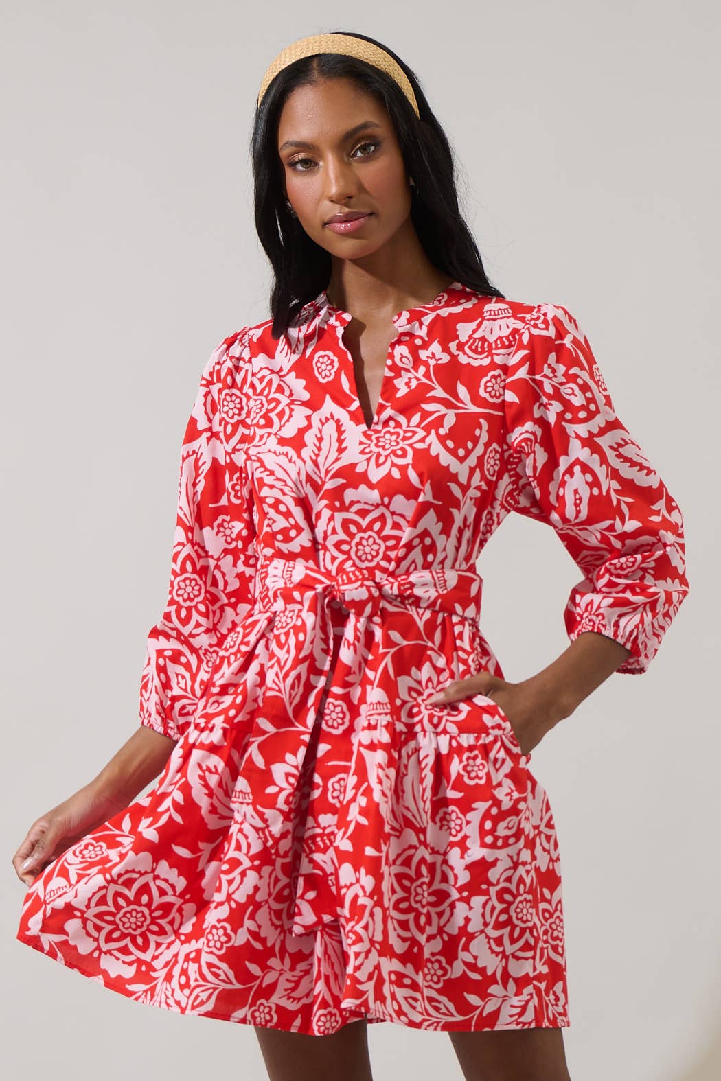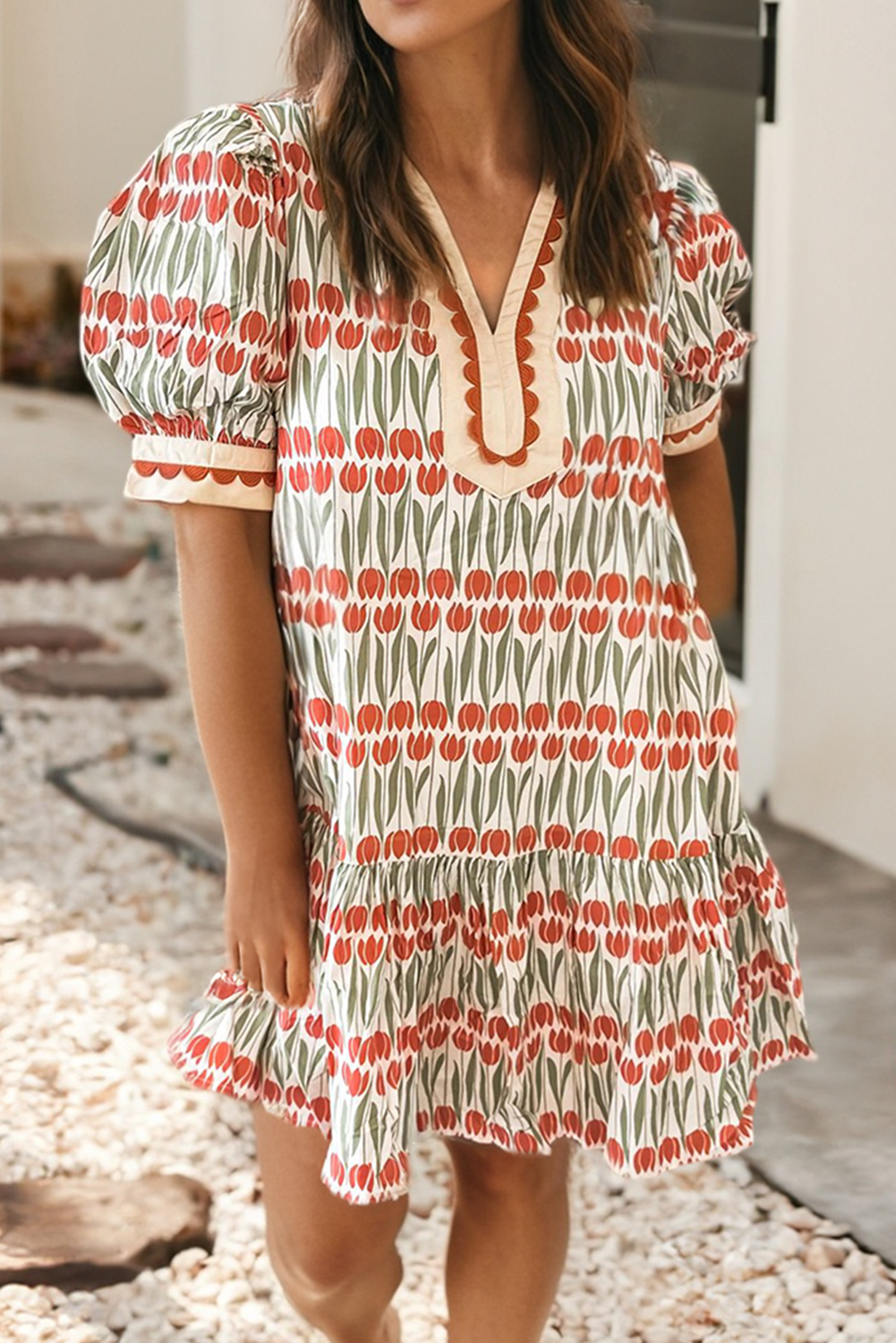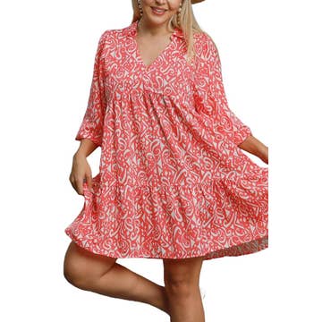 floral print tie neck smock dress