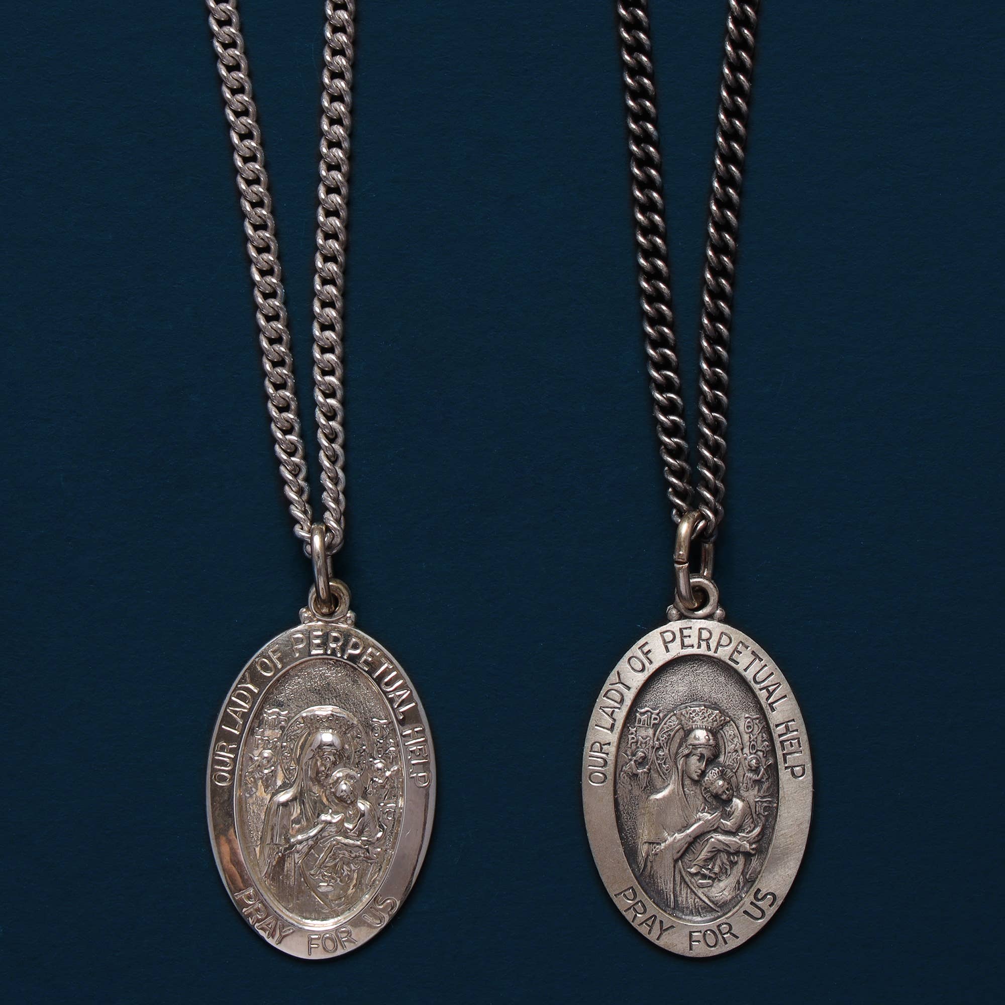 Maria is a beautiful double sided vintage pewter reproduction of a Dutch catholic medal and comes in gold, silver or rustic brown. This large medal is 36mm and it’s front close aged brass 9x6mm etched oval link chain measures 18 inches long. The medal front translates to: Queen Protector Mother with an image of mother and child and the back reads: Maria Congregation and the monogram JHS inside a shining sun. Originating in Medieval Western Europe, JHS is a Latin acronym for Jesus Hominum Salvator – Jesus Savior of Mankind.