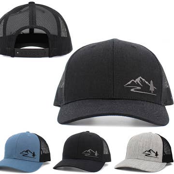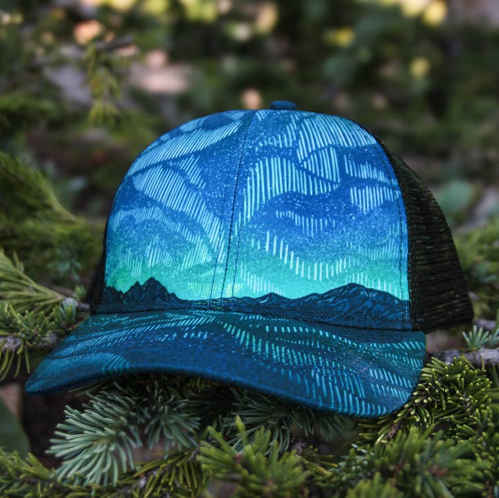 The Stargazer trucker hat features hand-drawn constellations above mountain peaks bordered by silhouettes of pine trees and mountain wildlife. Perfect for the stargazer and night sky enthusiast. PLEASE NOTE: Our current stock of Stargazer Trucker Hats temporarily features a brighter orange bill than earlier versions. See listing photo color. ITEM DETAILS Alpinecho's trucker hats are made in partnership with Purnaa, a social enterprise and World Fair Trade Organization Guaranteed Member (WFTO) in Nepal with a mission to create jobs that empower marginalized people to fresh starts and fulfilled lives. At Purnaa, staff receive technical skills training, life-skills training, access to counseling, healthcare, and employer-matched savings in a positive work environment. For more information on how these hats are made and who makes them, see the hat page on our website. * Full-color, mid-profile front, black mesh back with snap back * One size fits most * 100% recycled polyester