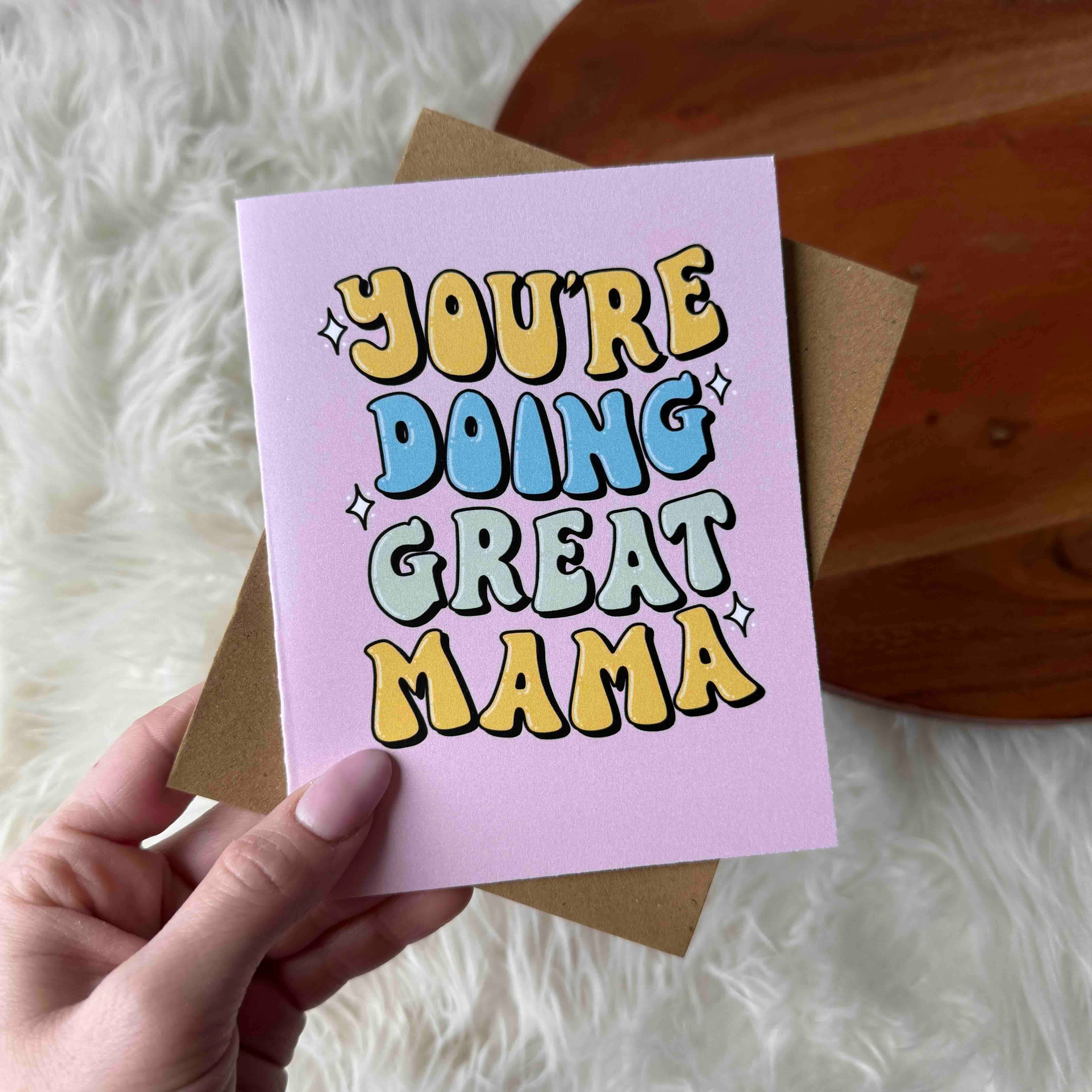 FRONT: Got it* from my mama *Total awesomeness INSIDE: blank DETAILS: • Dimensions - one 5x7 folded card • Paper - 100# natural cardstock, 100% recycled • Envelope - blue recycled envelope (A7) • Packaging - sealed in a clear sleeve